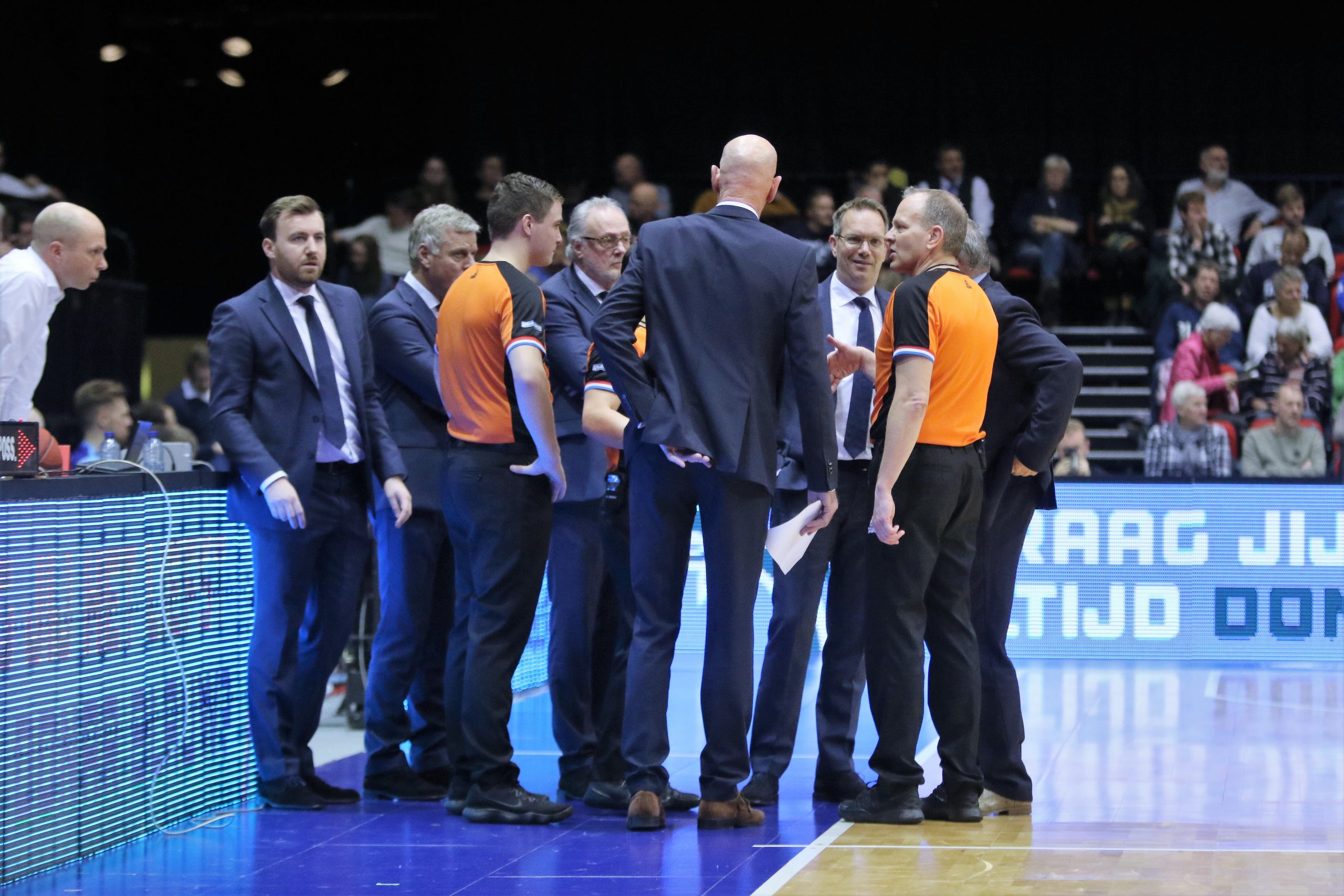 Overleg tussen de scheidsrechters en de coaches na het eerste kwart (foto: Gerrie van der Boom - FotoKlick Fotografie)