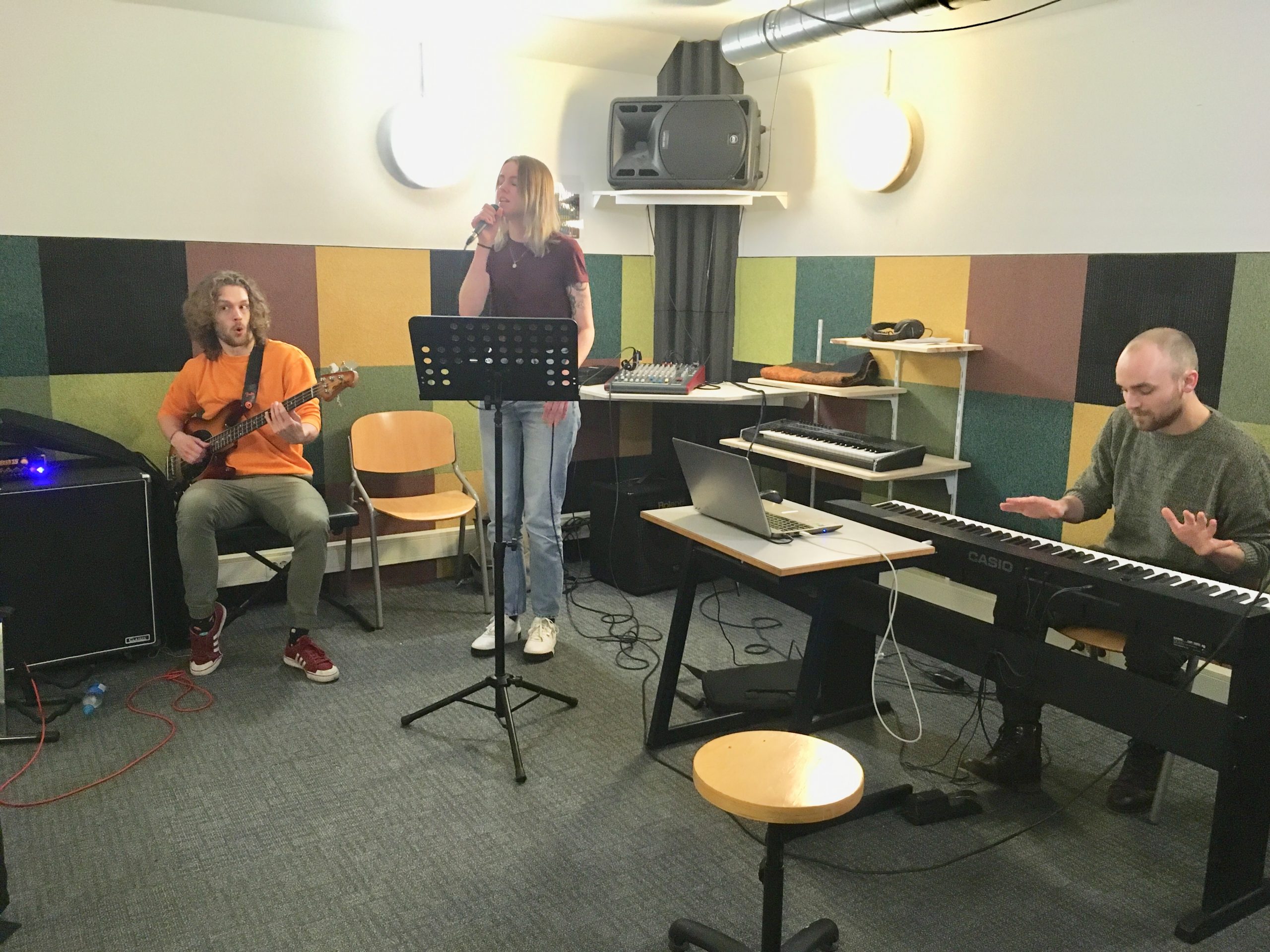 Studenten van de muzikantenopleiding van Noorderpoort waren vandaag druk bezig om hun nummers te repeteren. “Hoe fantastisch zou dat zijn om je eigen nummer om te toveren en uiteindelijk op te treden? Ik vind het niet spannend, alleen maar leuk,” vertelt Jikke. Melody wil vooral veel leren. “Het is geweldig om samen te kunnen spelen met goede muzikanten. Daar krijg je een inspiratiebom van.”
