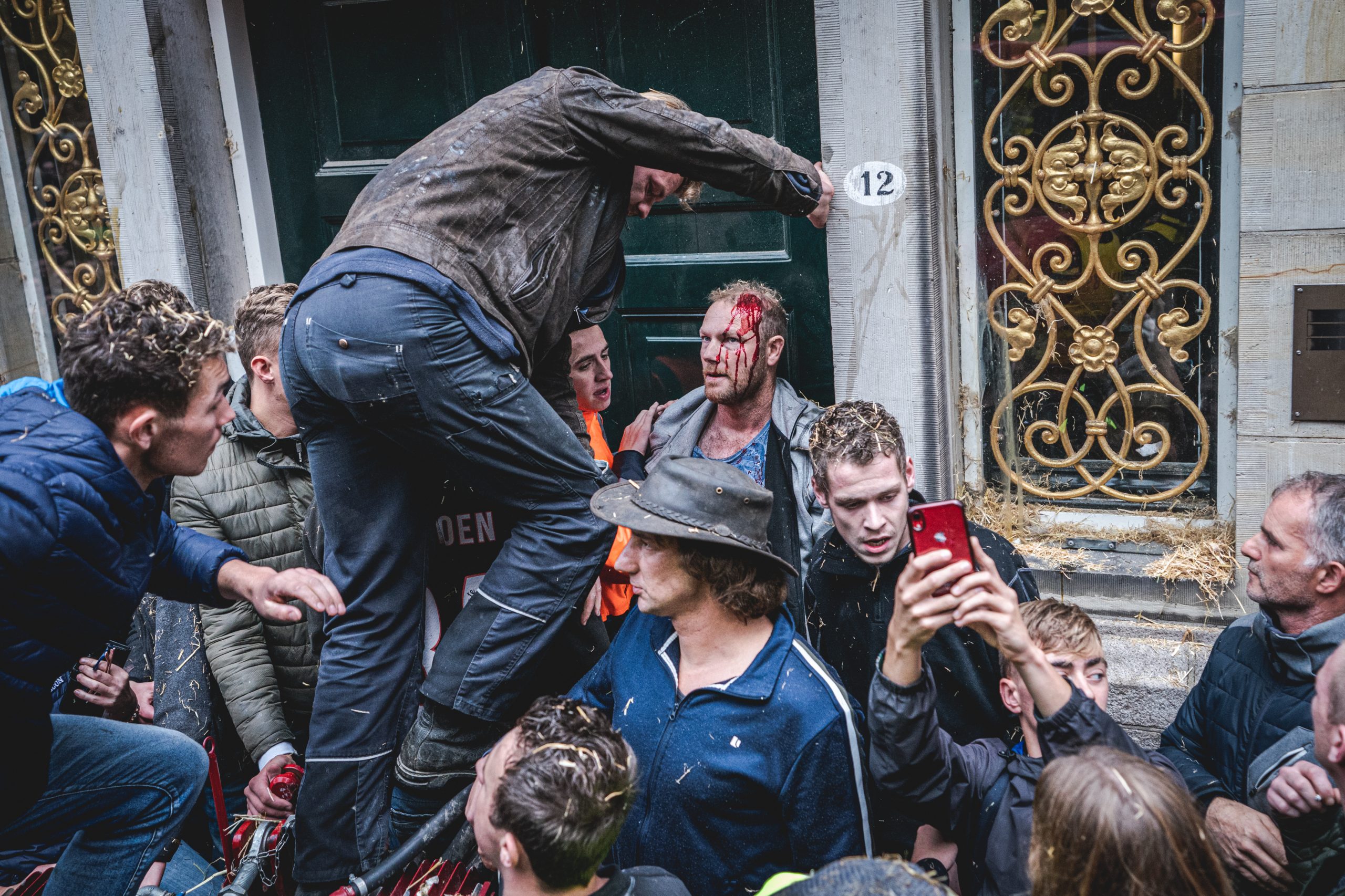 Het gaat om een foto van een boer met een bebloed hoofd.De foto is gemaakt op 14 oktober, net nadat boze boeren de deur van het Provinciehuis hadden in geramd met een tractor.