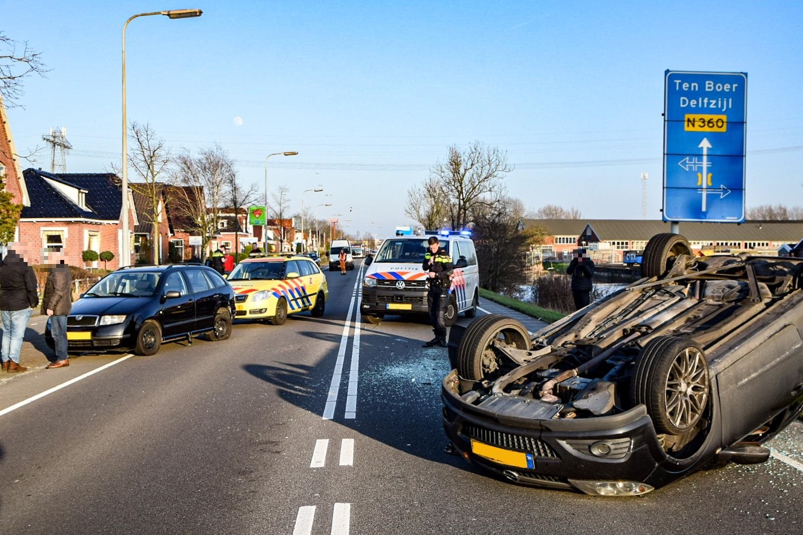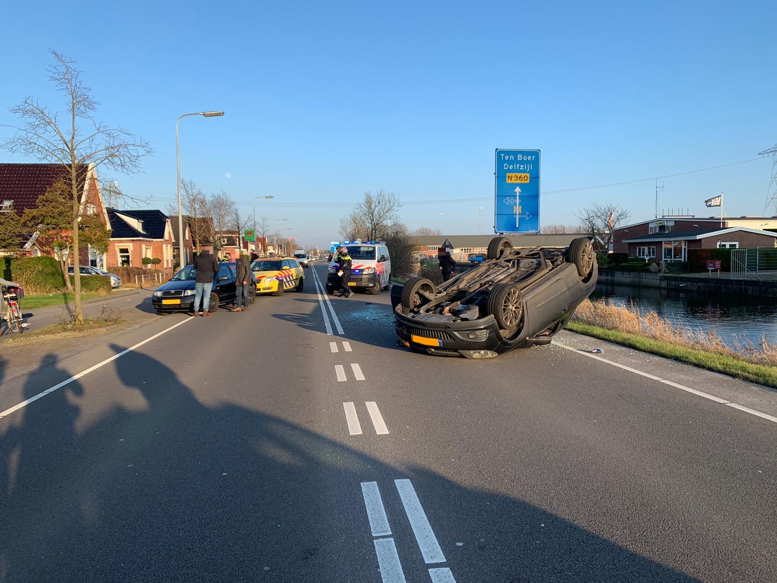 Het ongeluk gebeurde rond 16.00 uur. “Hoe het precies heeft kunnen gebeuren is onbekend”, vertelt Ten Cate. “Zoals ik het interpreteer zijn twee personenauto’s met elkaar in botsing gekomen. Eén van de auto’s is daarbij over de kop geslagen en ondersteboven op de weg beland. De politie en een ambulance zijn ter plaatse om eerste hulp te verlenen.” Voor zover bekend is niemand gewond geraakt.