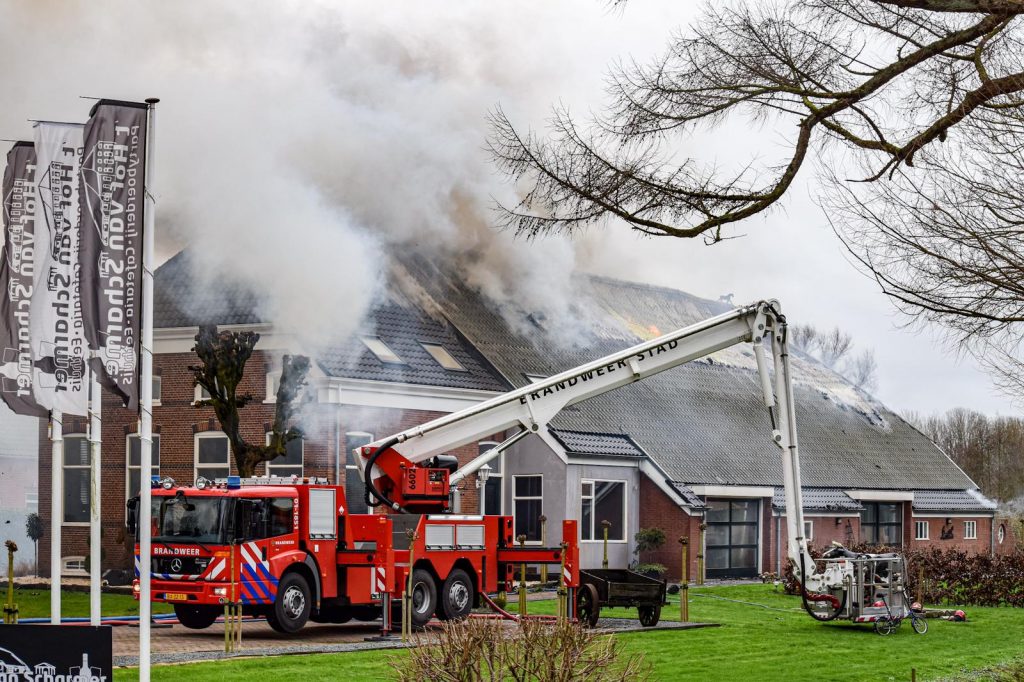 De Stadse brandweer assisteert maandagmiddag met verschillende voertuigen bij een grote brand in een partyboerderij in Scharmer. Bij de brand komt veel rook vrij.