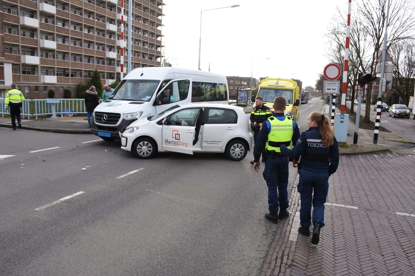 Een taxibusje en een personenauto zijn maandagmiddag op de busbaan aan de Oosterhamrikkade met elkaar in botsing gekomen.