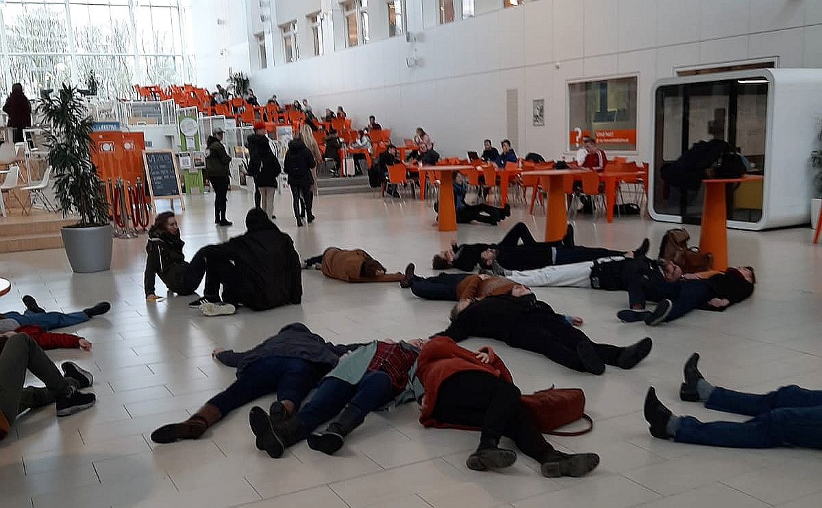 Al voor de start van de protestactie werd het eerste spandoek bevestigd aan het viaduct onder Ringweg, tussen het Wilgenpad en de Zernike Campus. Ook aan het ringwegviaduct over de Zernikelaan hing een spandoek. In de aula onder de Van Olsttoren (een gebouw van de Hanzehogeschool) lieten de demonstranten zich onder het luiden van een sirene ‘dood neer vallen’. Vervolgens herhaalden ze deze actie in de Kapteynsborg (een gebouw van de RUG). De demonstranteen deelden verder flyers uit aan passanten.