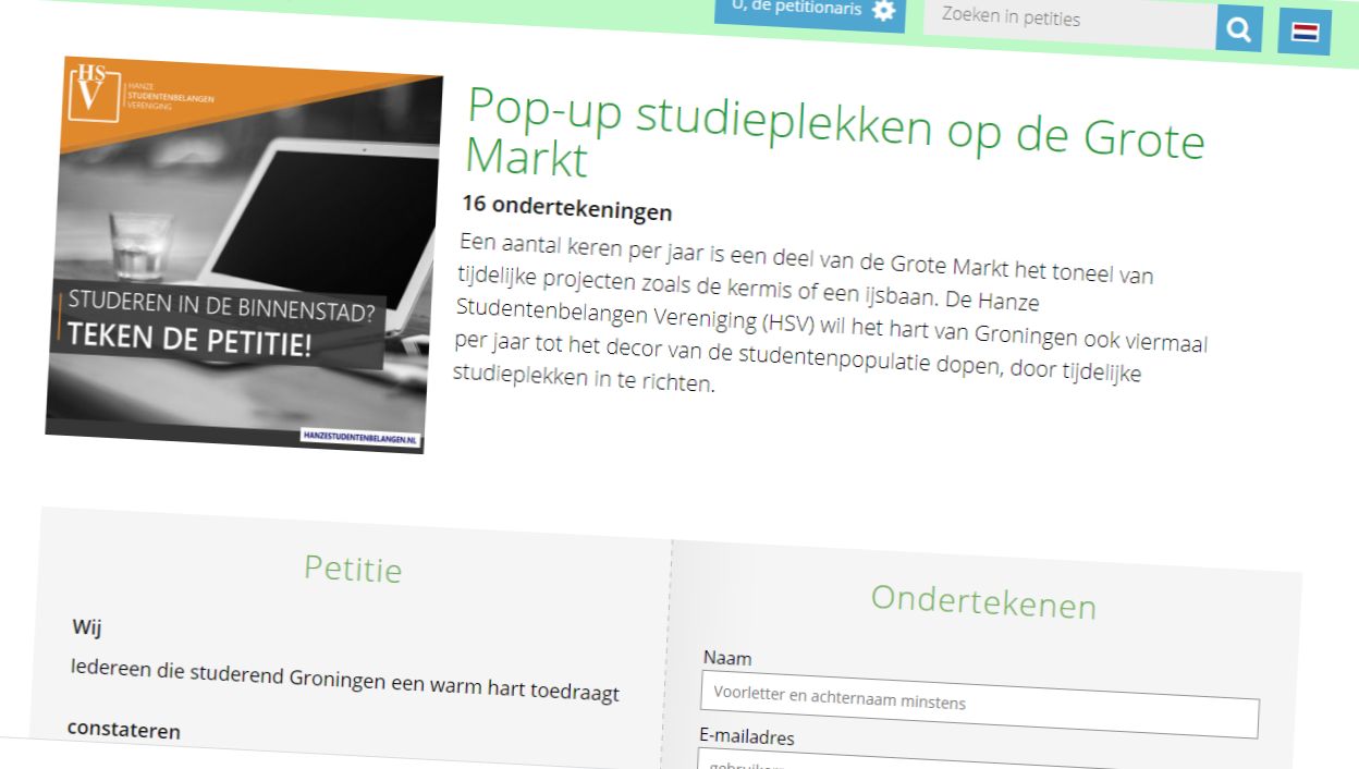 De Hanze Studentenbelangen Vereniging wil viermaal per jaar tijdelijke studieplekken inrichten op de Grote Markt. Daarom lanceert het vrijdagochtend de petitie ‘Pop-up studieplekken op de Grote Markt.’