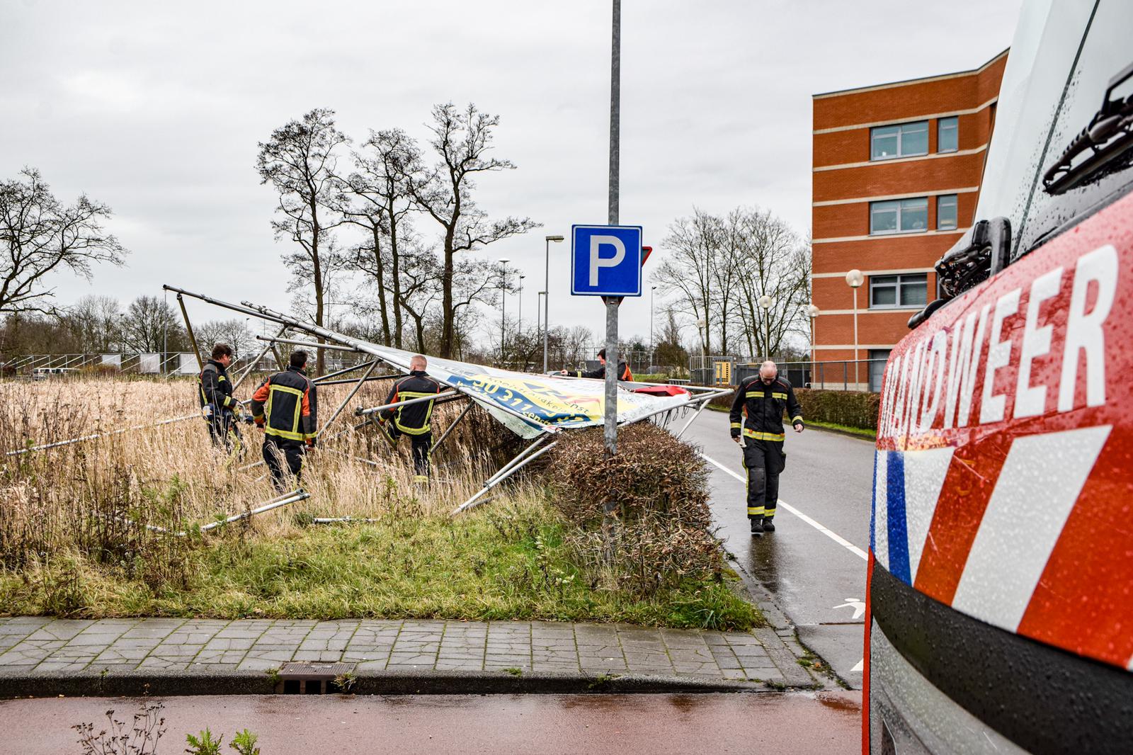 Aan de Eemsgolaan is een reclamebord omgewaaid. Foto’s: Rick ten Cate – tencatefotografie.nl