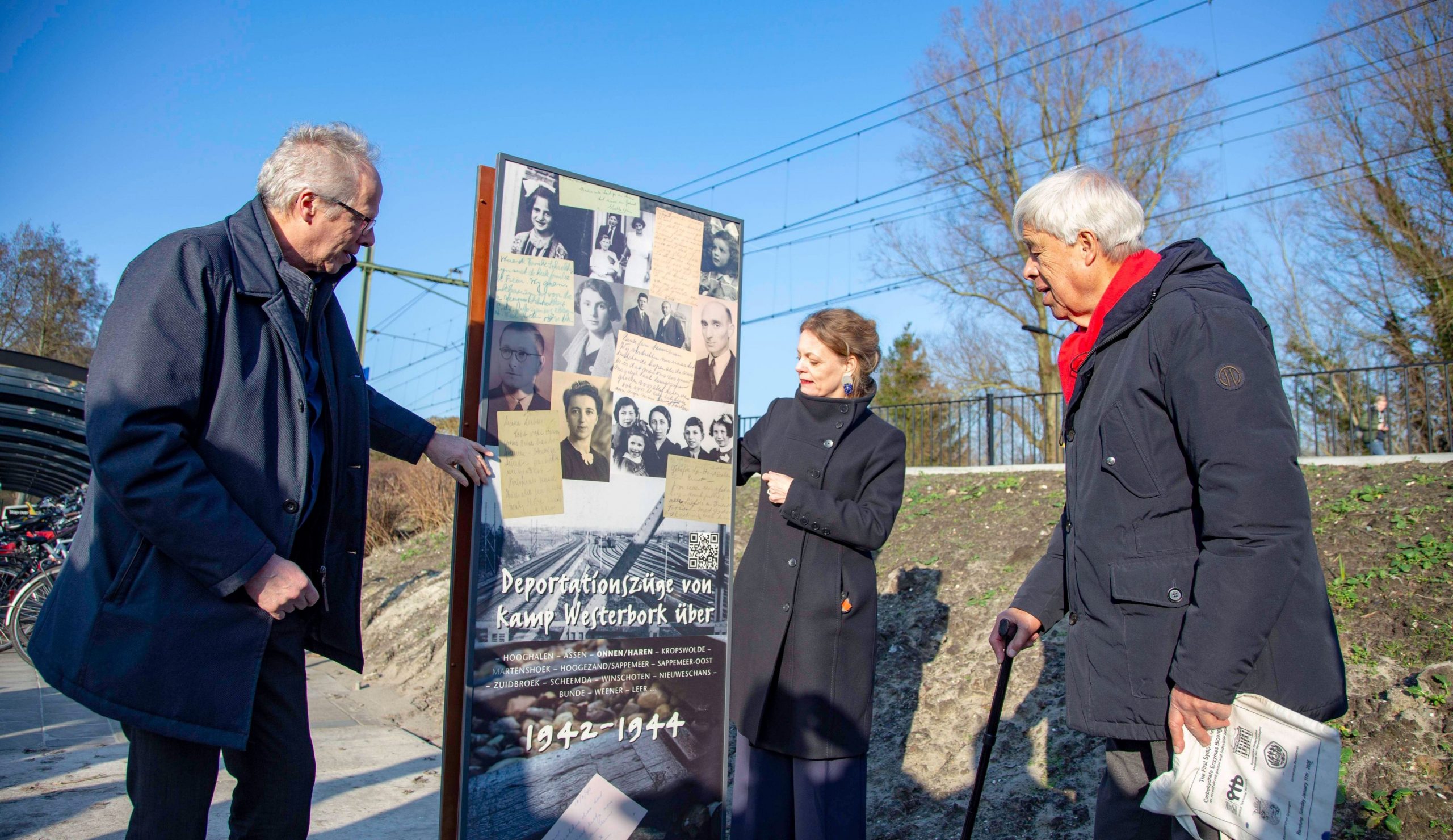 Op het station in Haren is vrijdagmiddag een oorlogsmarkering onthuld. Wethouder Philip Broeksma, Gerdien Verschoor (directeur Herinneringscentrum Kamp Westerbork) en dhr. Beintema (initiatiefnemer van de markeringen) onthulden de markering.