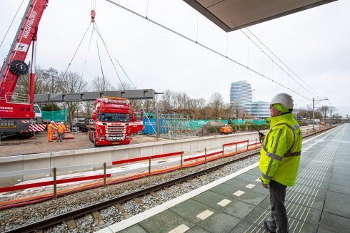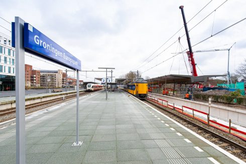 Station Europapark wordt op dit moment verbouwd. Vanwege de komst van opstelterrein De Vork tussen Groningen en Haren wordt er een vierde spoor aangelegd tussen het Hoofdstation en het nieuwe rangeerterrein. Hiermee krijgt station Europapark een extra perron. “De perronkappen zijn in vier verschillende delen aangeleverd”, vertelt een woordvoerder van ProRail. “Vrijdag arriveerden de eerste twee delen, maandag de laatste twee. Ieder gedeelte weegt twintig ton, is 24 meter lang en vijf meter breed.”