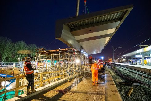 De nieuwe perronkappen van station Europapark liggen op hun plaats. Met uiterste precisie werden maandag de laatste twee delen op hun plaats gelegd.