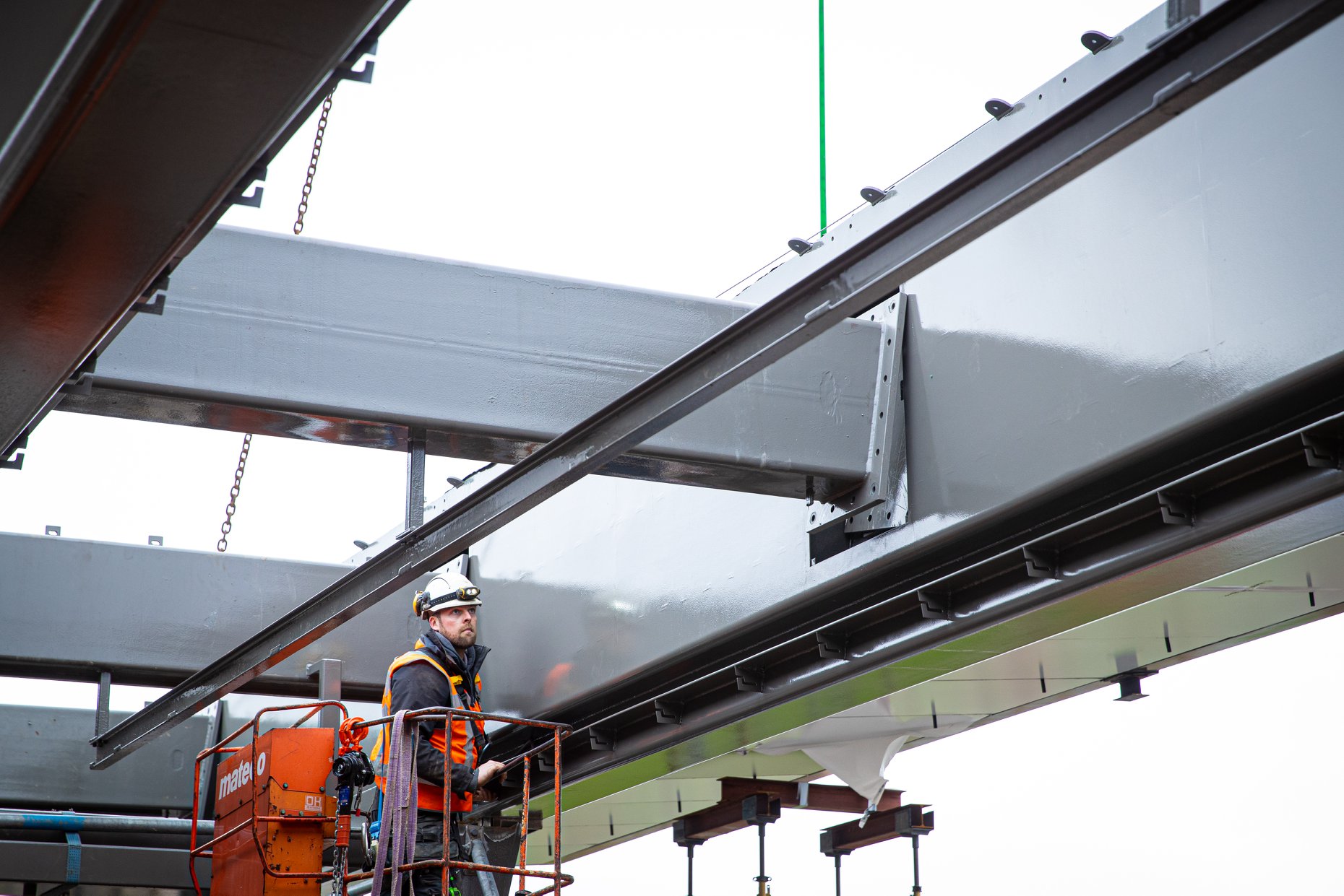 Het vervoer van de kappen was een grote logistieke operatie. “Vooral de breedte van het transport zorgde voor een uitdaging. Samen met de gemeente Groningen waren parkeerplaatsen langs de route afgezet zodat we niet vast kwamen te staan.” Eenmaal op de bouwplaats werden met een hijskraan de kappen op hun plek getild. Dat de kappen nu op hun plek liggen betekent niet dat de werkzaamheden klaar zijn. “De komende weken gaan we dakbedekking aanbrengen en worden er ramen geplaatst.