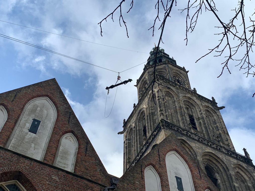 De wijzers en andere onderdelen van de vier uurwerken van de Martinitoren zijn dinsdag, onder begeleiding van alpinisten, naar beneden gehaald voor een opknapbeurt.