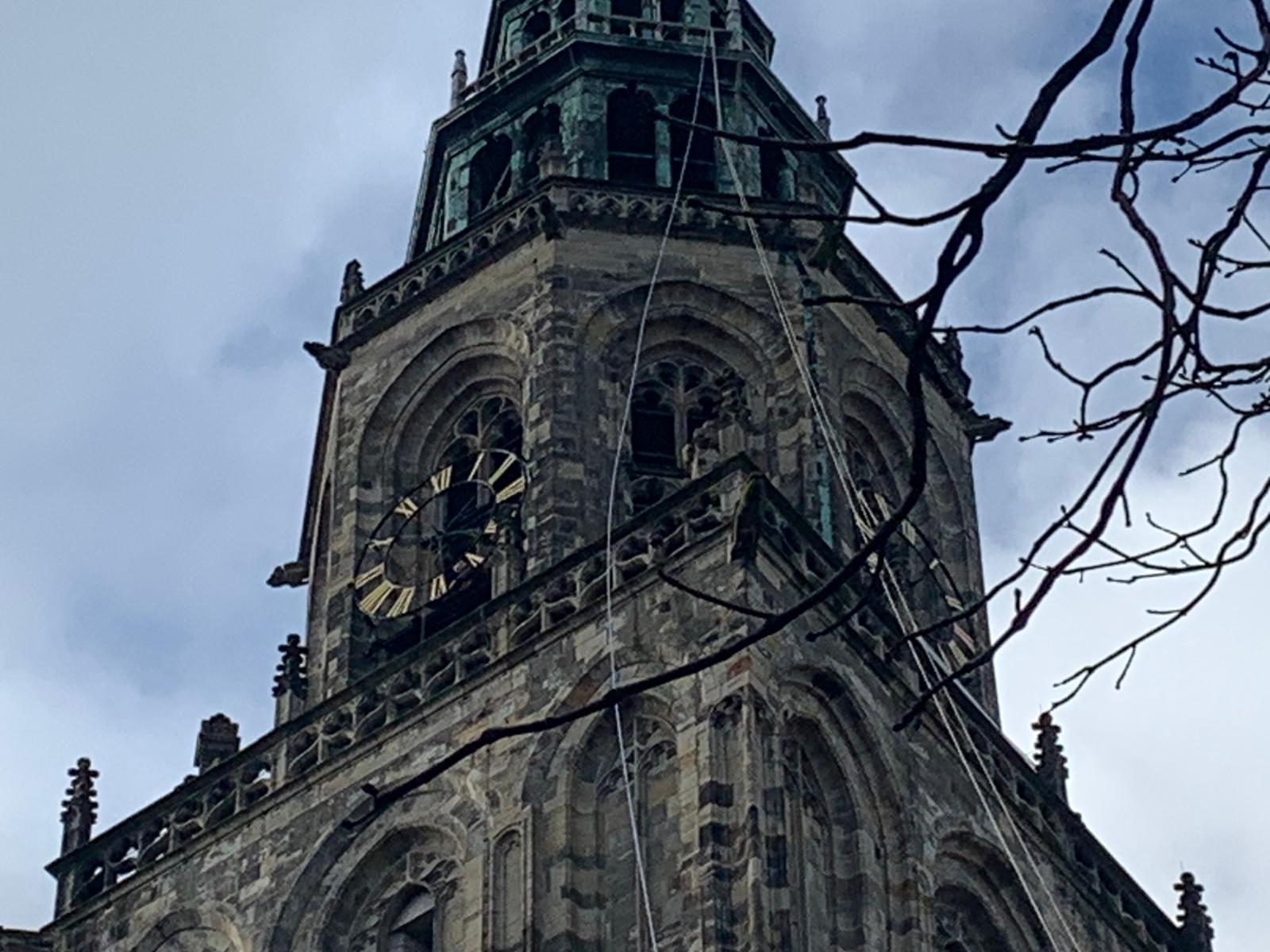 De wijzers en andere onderdelen van de vier uurwerken van de Martinitoren zijn dinsdag, onder begeleiding van alpinisten, naar beneden gehaald voor een opknapbeurt.