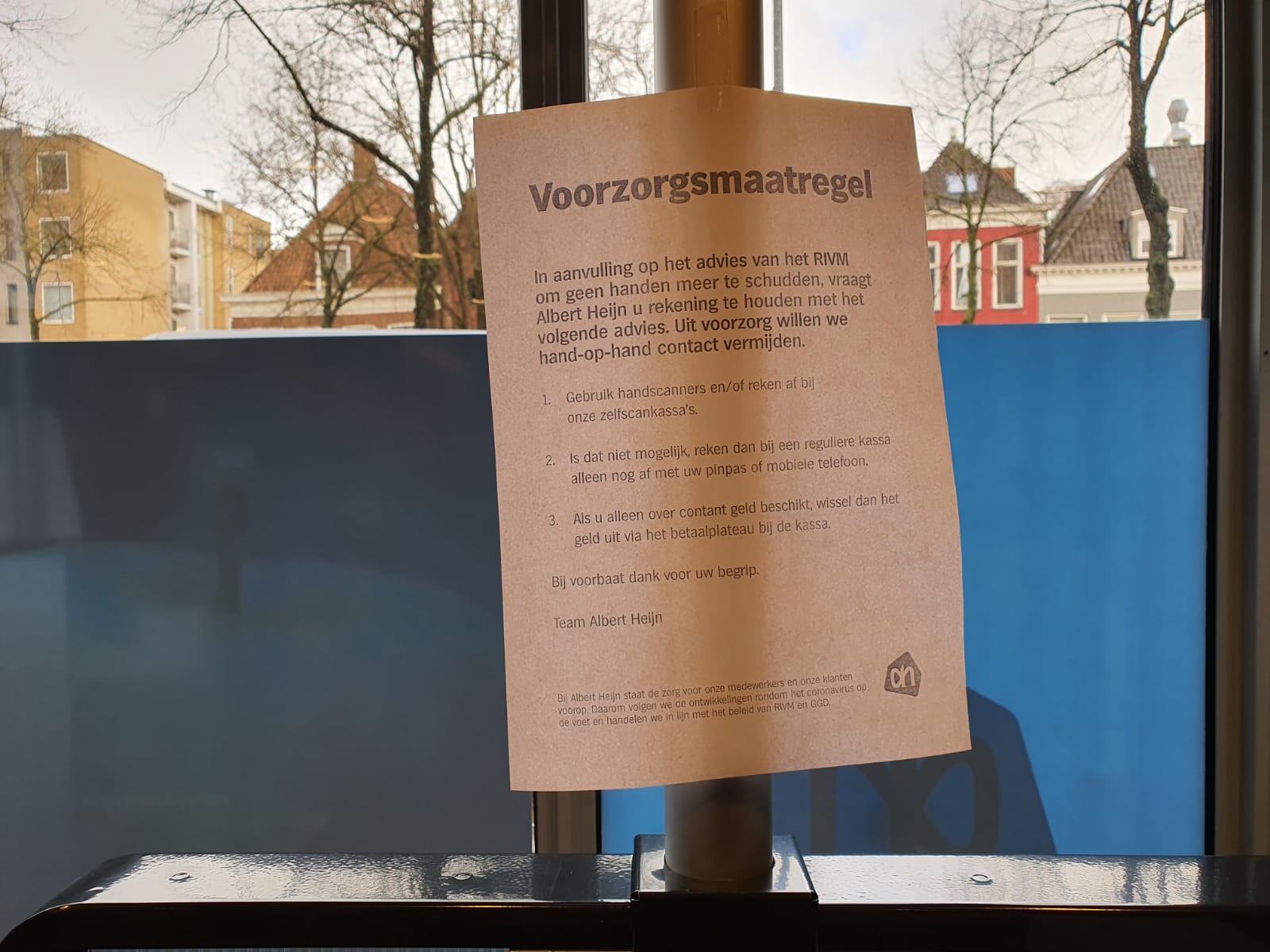 Ook supermarkten in Groningen nemen maatregelen om besmetting met het coronavirus te voorkomen. De Albert Heijn aan het Zuiderdiep adviseert klanten om zo min mogelijk contant te betalen en gebruik te maken van de zelfscan-kassa’s.