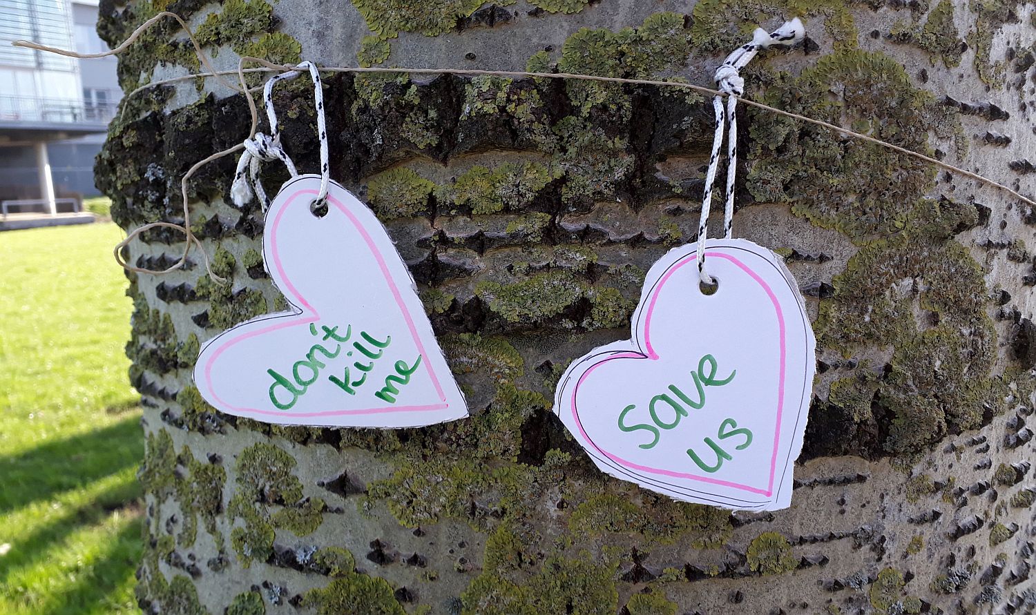 Een aantal studenten van de Hanzehogeschool heeft aan een deel van de honderden bomen die aan de Zernikelaan gekapt dreigen te worden, borden en teksten te hangen.