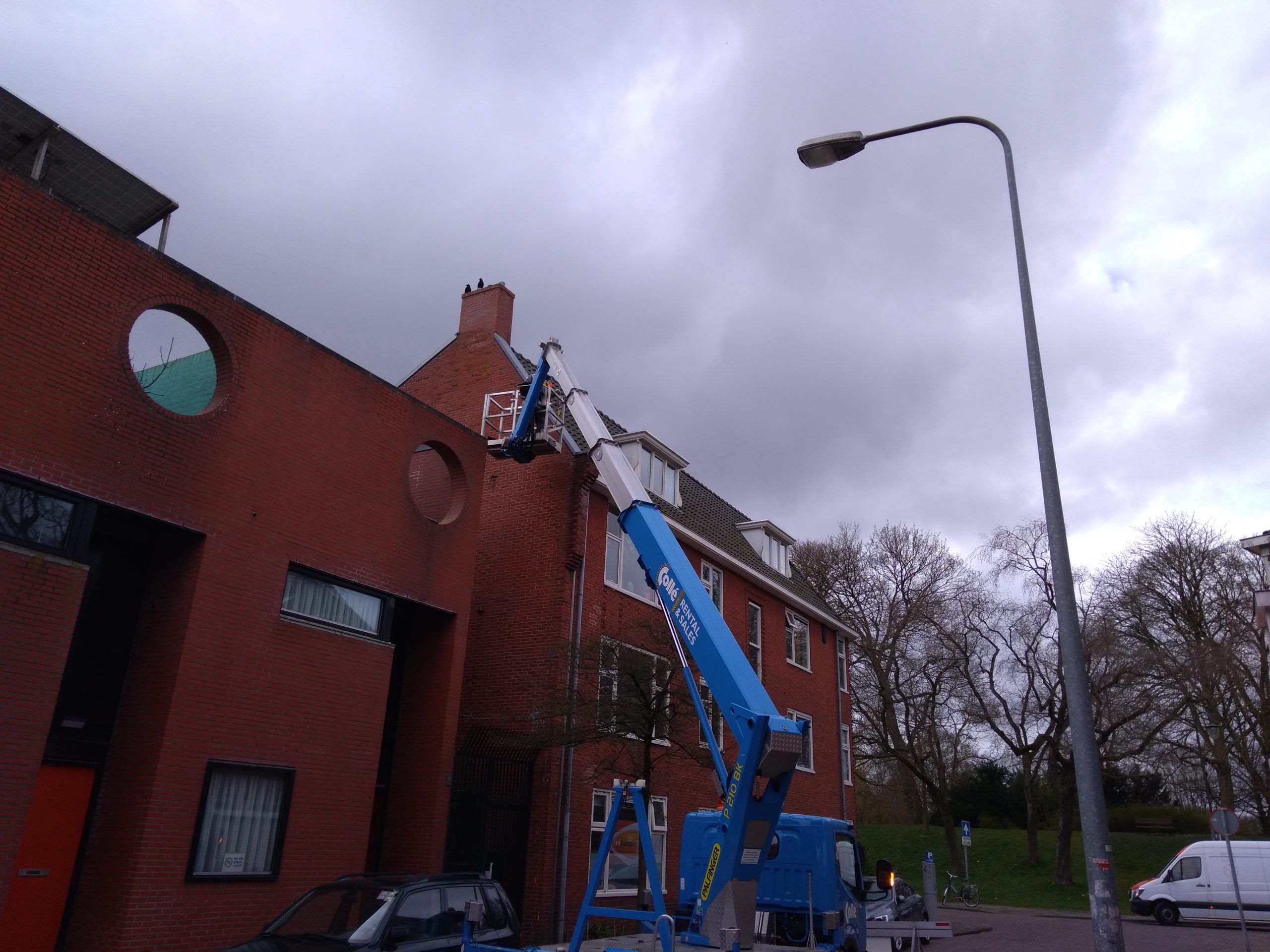 Bij de woningen aan de Noorderbinnensingel en omgeving is momenteel een hoogwerker actief. Hier vandaan worden de verschillende soorten nestkasten geplaatst, veelal boven aan de gevels.