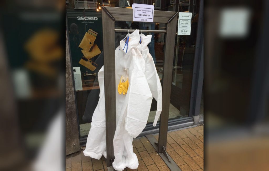 Kledingzaak EBB 18 aan de Oude Ebbingestraat hing vrijdag voor de grap witte beschermingspakken voor de winkel. Studenten van Vindicat die de jeanszaak willen betreden “moeten” het isolatiepak aan doen om eventuele verspreiding van het coronavirus te voorkomen.