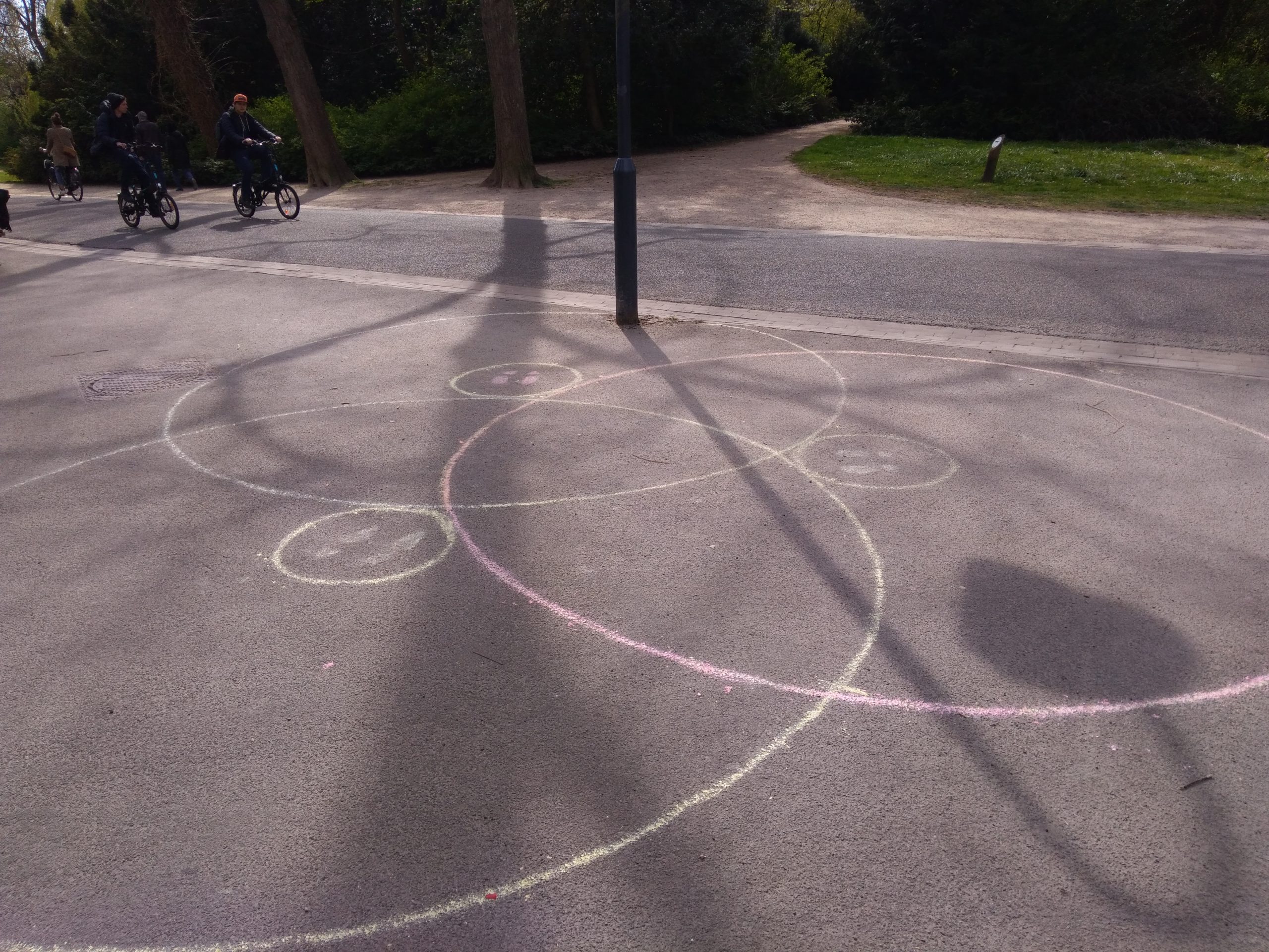 Op een bruggetje bij het Stadspark is bij een leuning een kleine cirkel op de weg gemaakt. En daarom heen een grote cirkel. Dan het Noorderplantsoen. Hier is een zogeheten venndiagram, drie overlappende cirkels, gebruikt om aan te geven wat de afstand moet zijn als drie mensen elkaar ontmoeten. Er staan voetstappen getekend in de kleinere rondjes in de cirkels. Komen er meer mensen, dan blijven die buiten het diagram.