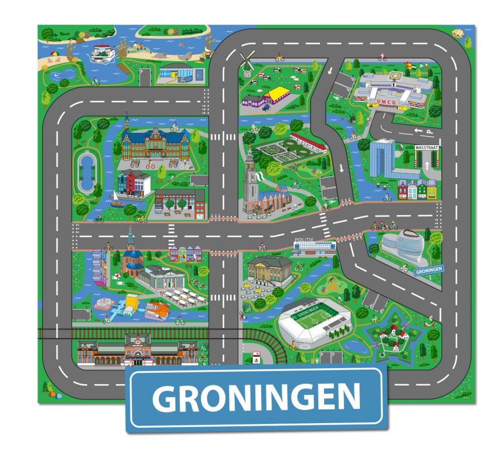 Het Speelkleed Groningen komt over twee maanden op de markt. Het toont een bijzondere kaart van Groningen. Ergens bij Beijum stap je zo op de boot naar de waddeneilanden. Iets ten zuiden van de Euroborg ligt de vesting Bourtange. Als je nu bestelt moet je nog 61 dagen geduld hebben. Van de 49,95 euro die het kleed kost gaat 1 euro naar het goede doel.