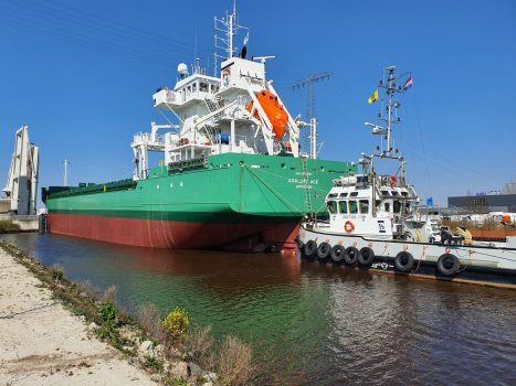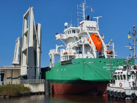 Het schip dat voorbij voer is de Arklow Ace. Een gloednieuw schip dat vorige maand te water werd gelaten bij scheepswerf Ferus Smit in Westerbroek. Het schip heeft een lengte honderdtwintig meter en een breedte van vijftien meter. Het is het derde schip in een serie van zes die voor het bedrijf Arklow gebouwd worden. Het schip gaat gebruikt worden voor het vervoer van tarwe en mais in Europese wateren.