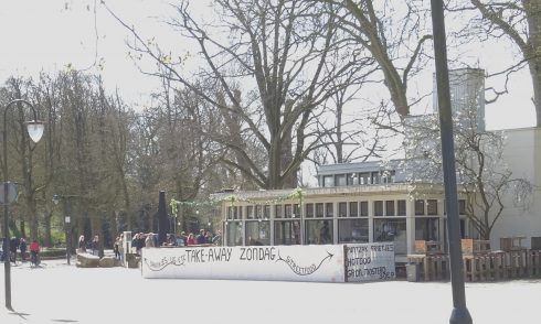 Het restaurant in het plantsoen is open, maar er kan alleen eten en drinken afgehaald worden. Er staat een rijtje mensen voor de zaak en daar kan misschien wel iets meer afstand genomen worden.