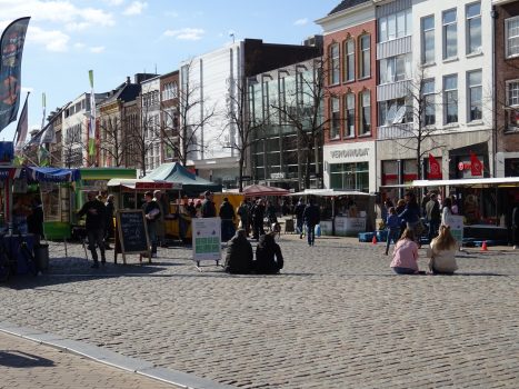 Het zorgenkindje is de Vismarkt waar de markt met verse producten staat. Rond 14.30 uur is er redelijk wat volk, maar de meeste mensen houden voldoende afstand en de marktkooplui hebben daarvoor ook maatregelen genomen.