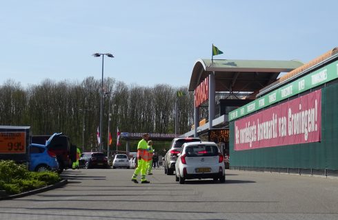 Bij de bouwmarkt Hornbach, net buiten de stad, wordt een beperkt aantal mensen binnen gelaten. Er staat een kleine groep wachtenden voor de deur en bezoekers die aan komen rijden krijgen winkelinstructies van het personeel. Door het vele klussen en het tuinseizoen blijft het onverminderd druk bij de bouwmarkten.