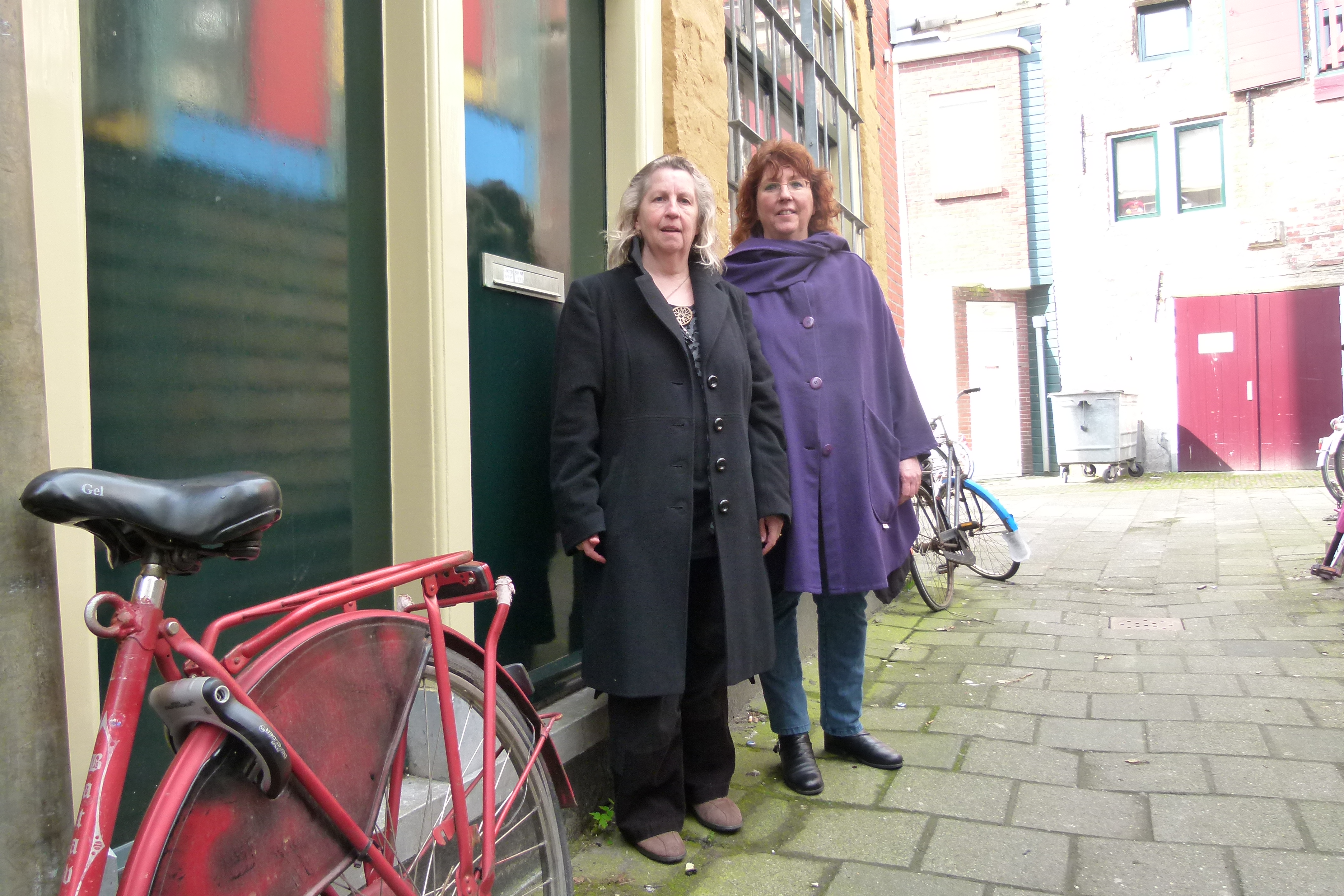 Inge Klumper-Eleveld (l) en haar zus voor de woning van hun moeder in de Gelkingesteeg. Foto: Sebastiaan Scheffer