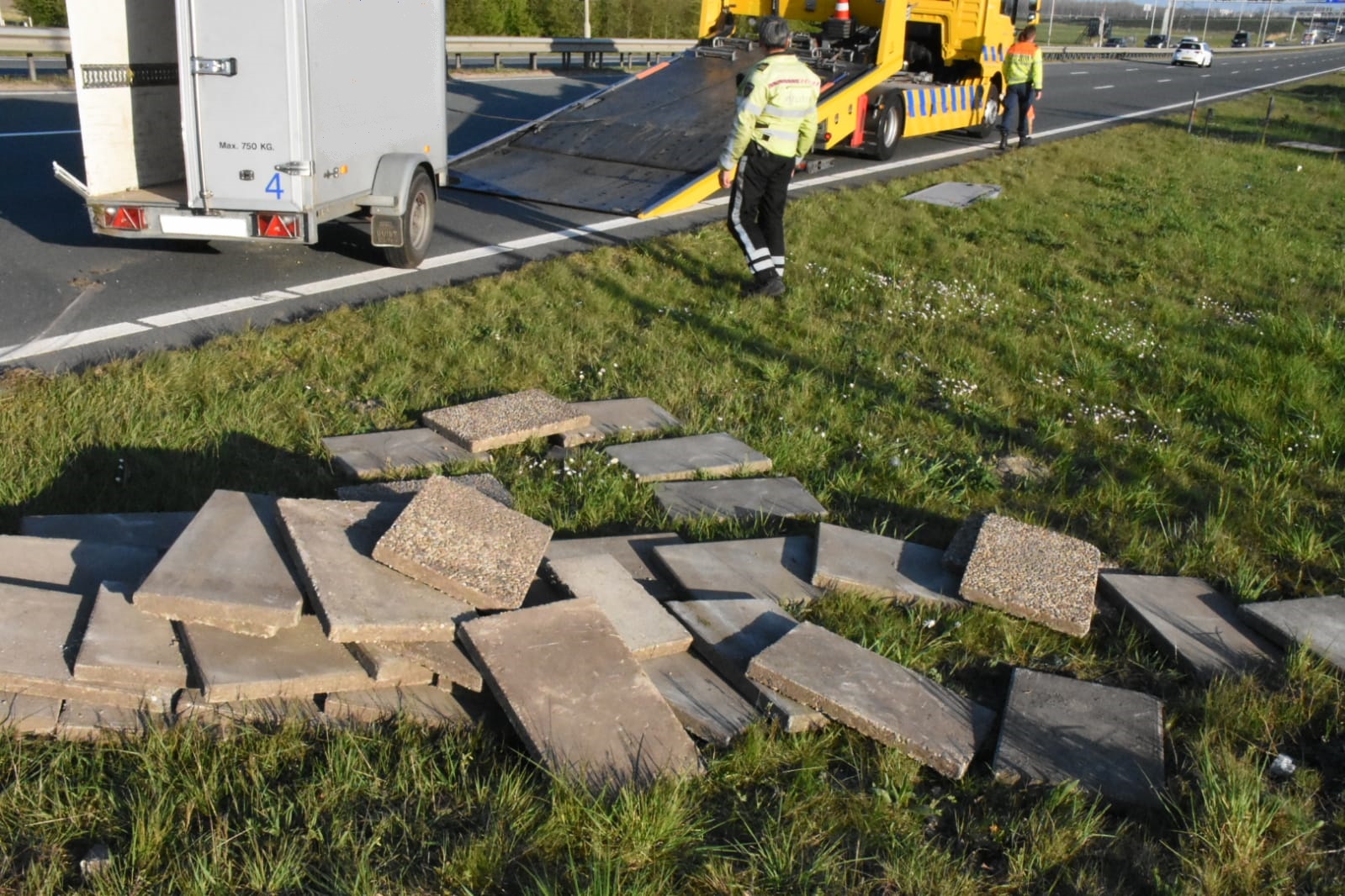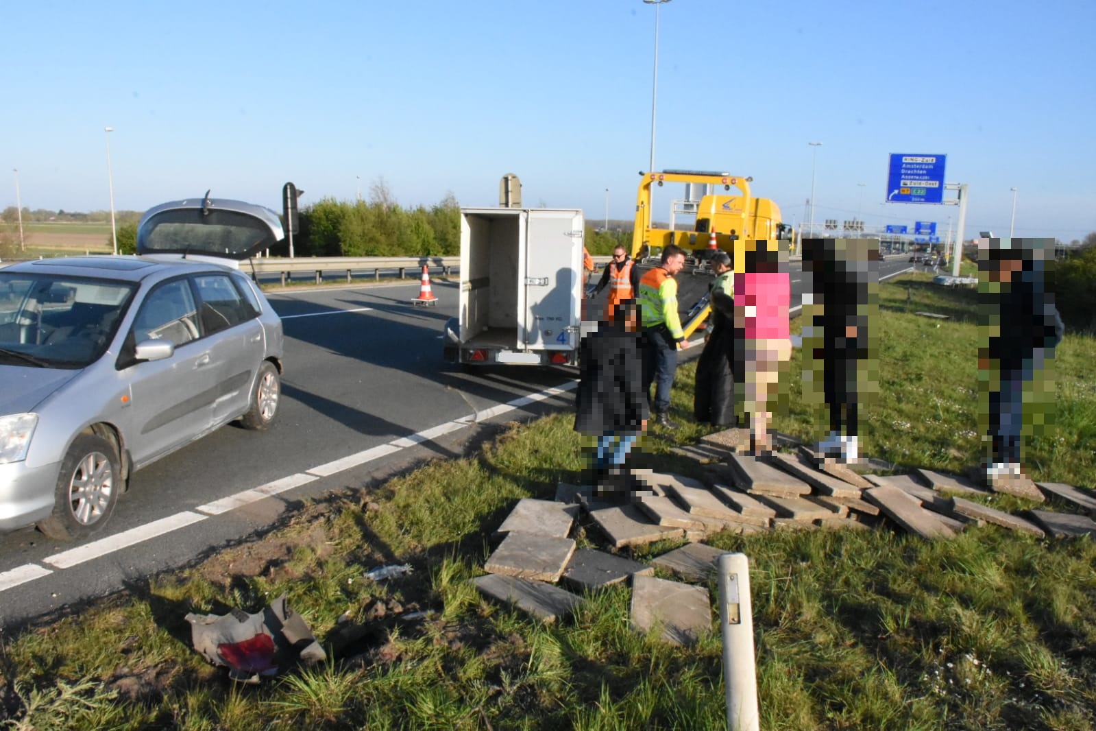 Het ongeluk gebeurde rond 18.40 uur ter hoogte van de afslag Driebond. “Hoe het precies heeft kunnen gebeuren is onbekend”, vertelt Nuver. “Ik sprak een agent en die vertelde dat het vermoedelijk komt omdat de aanhanger te zwaar beladen is. In de aanhanger zaten zo’n veertig stoeptegels van twintig kilo per stuk.” Bij het ongeluk raakte niemand gewond. Om het bergingsbedrijf veilig haar werk te kunnen laten doen werden er door Rijkswaterstaat twee rijstroken tijdelijk afgesloten.