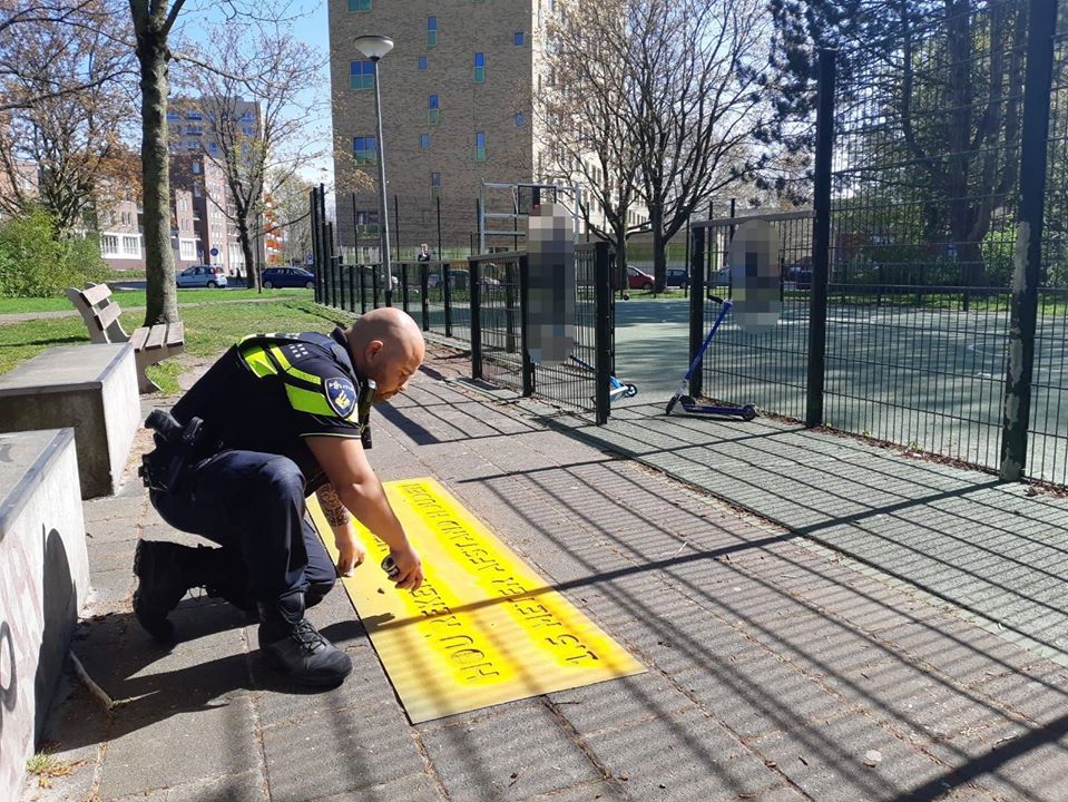 Agenten van het basisteam Groningen Noord en een medewerker van het Actiecentrum Veiligheid en Zorg (AVZ) hebben woensdag teksten aangebracht op diverse pleinen in de stad.