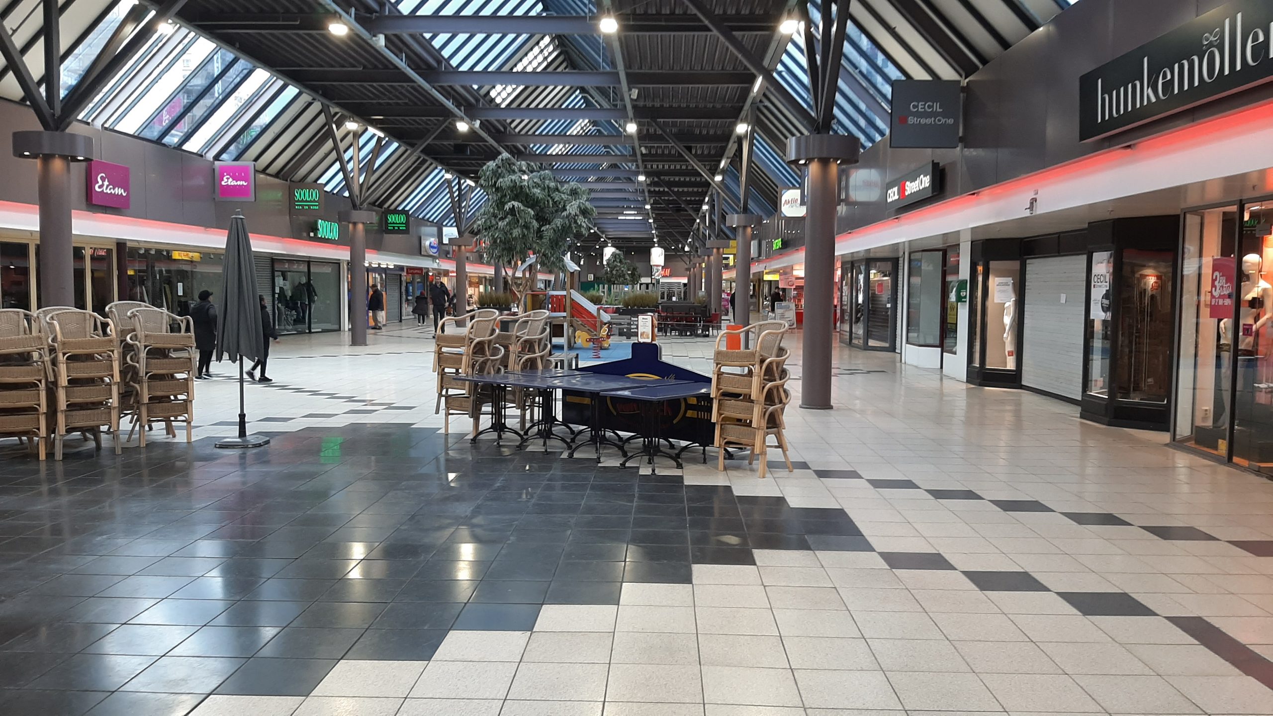 Alleen bij de supermarkt was vrij veel volk, maar elders in het overdekte winkelcentrum waren de mensen op één hand te tellen. Terrasstoelen staan opgestapeld en de meeste winkels hadden om vijf uur al de deuren gesloten. Van een koopavond was geen sprake.