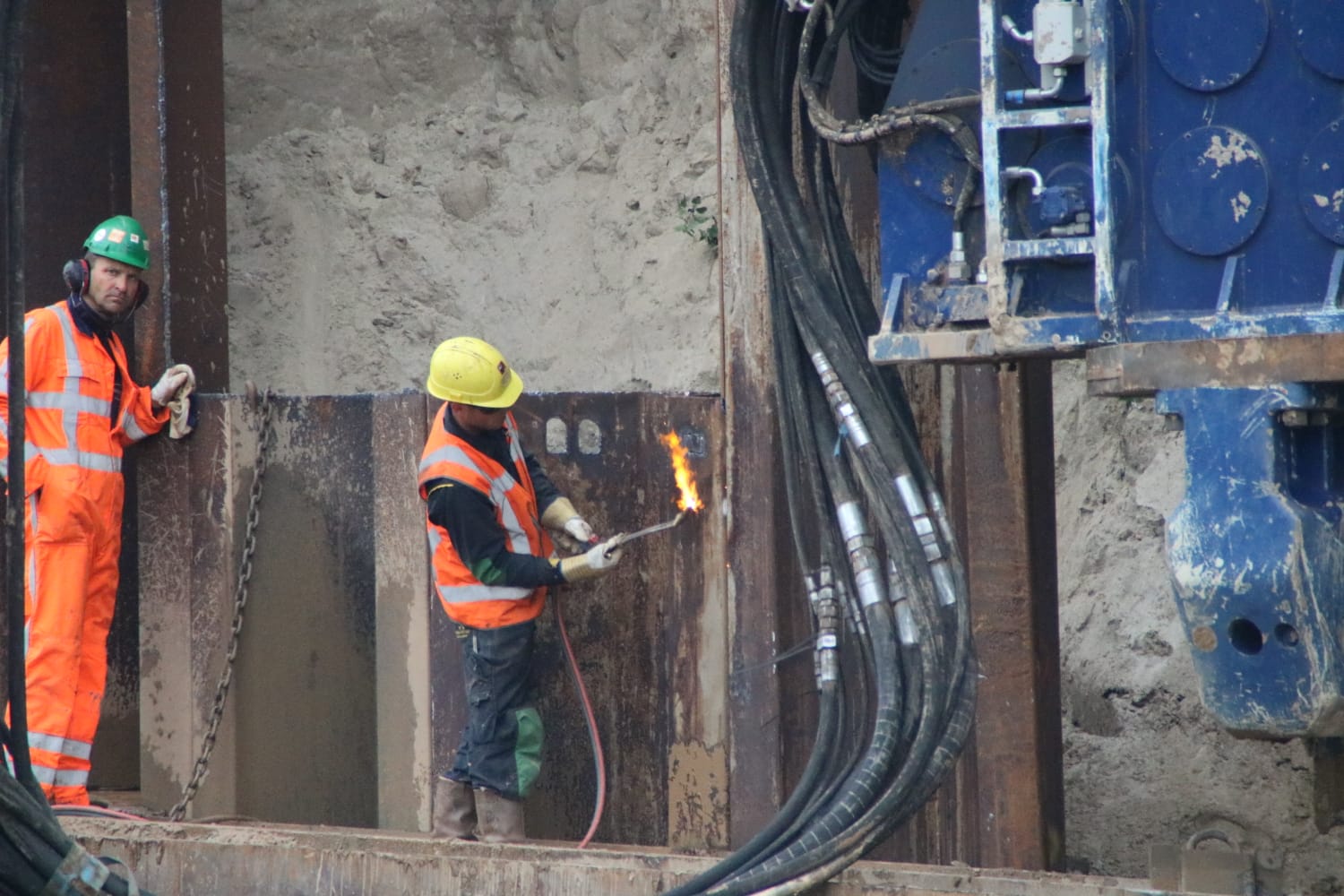 De werkzaamheden voor het intrillen van de damwandplanken begon afgelopen dinsdag. Door pech met het materieel is het intrillen nog niet afgerond en daarom moet er vrijdag ook door worden gewerkt. “Mocht het vrijdag ook niet lukken dan hebben we zaterdag als reservedag aangemerkt.”