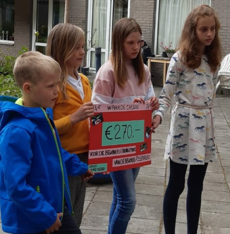 Daarmee is in totaal 840 euro ingezameld dat verdeeld gaat worden over drie goede doelen. Dat zijn de Voedselbank Groningen, Safe the Children en woonzorgcentrum Ebbingepoort. “Zaterdag hebben we de bewoners van de Ebbingepoort verblijd”, vertelt Mikešová. “Uiteraard gebeurde dat allemaal op veilige afstand in de tuin van het complex. Kinderen hebben uitgelegd wat er de afgelopen weken bij ons in de wijk gebeurd is en ze hebben twee liedjes voor de bewoners gezongen. Behalve het geld werd er ook een bloemetje overhandigd dat door één van de oudste bewoners van de Fossemaheerd beschikbaar was gesteld. En een grote supermarktketen bij ons in de wijk sponsorde cake voor bij de koffie. Wij hebben er een erg goed gevoel aan over gehouden, en de bewoners waren zichtbaar blij en dankbaar.”