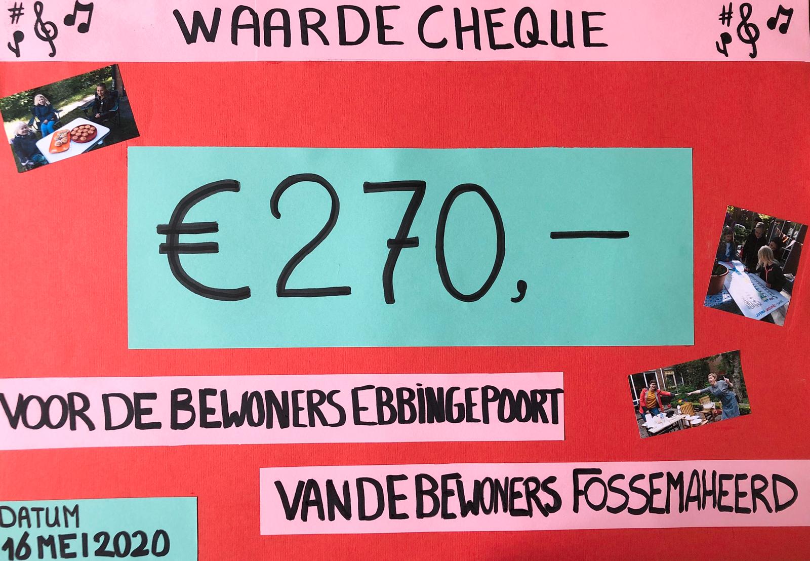 De bewoners van de Fossemaheerd in de wijk Beijum in Groningen hebben zaterdag een cheque van 270 euro overhandigd aan woon- en zorgcentrum Ebbingepoort. De overhandiging is naar aanleiding van een goede doelen-actie in de wijk.