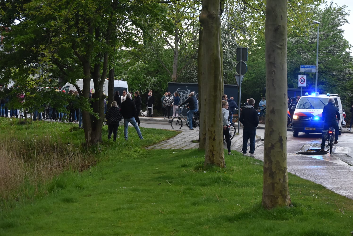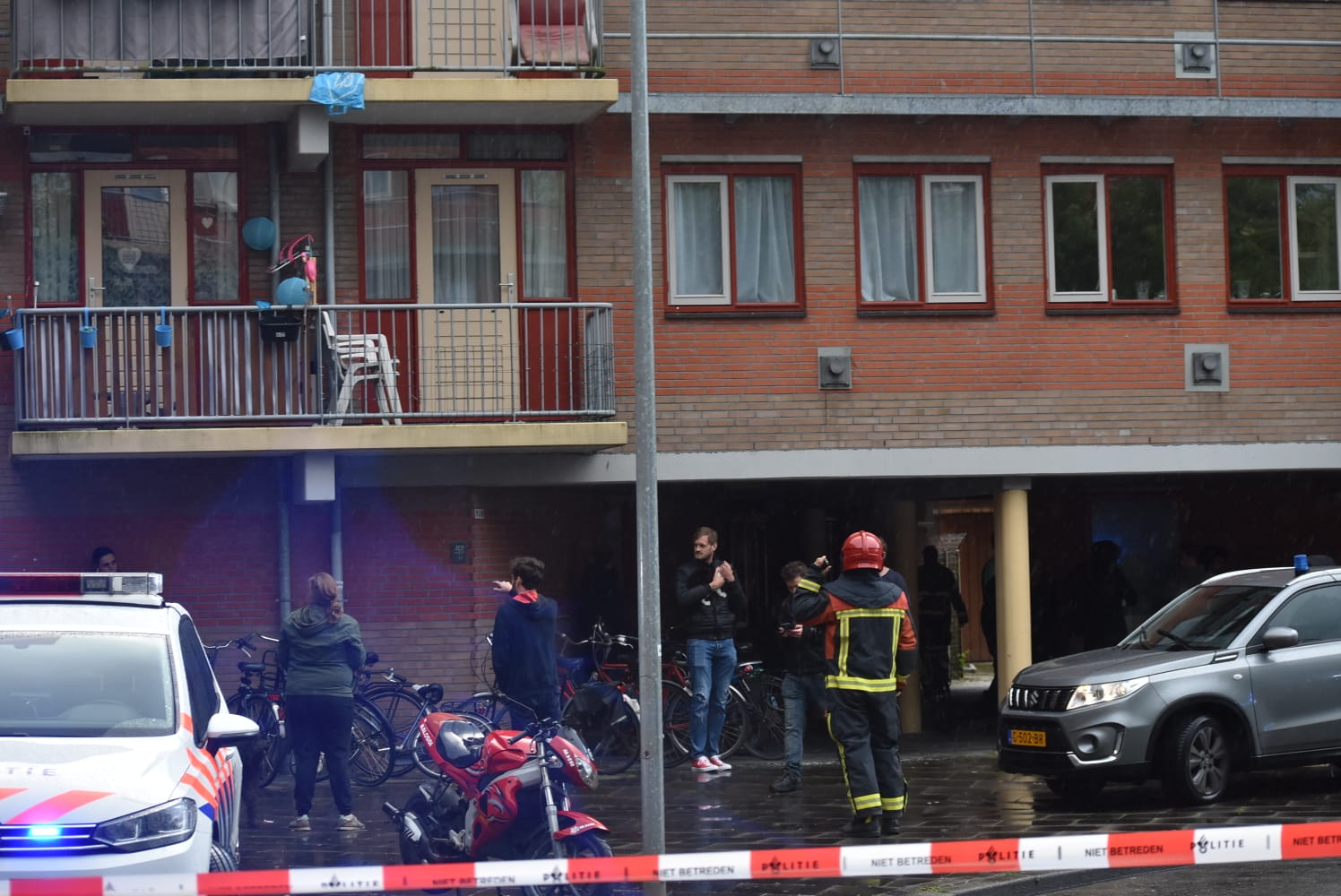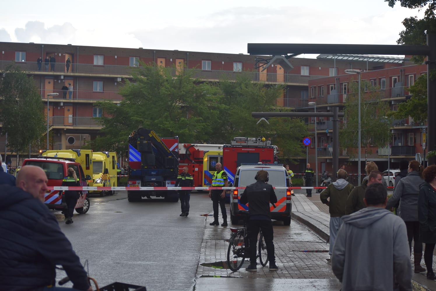 Om het publiek op afstand te houden heeft de politie een groot gebied rond de flat afgesloten. “Er zijn veel hulpverleners ter plaatse. Ik tel zo’n tien politiewagens. Verschillende agenten hebben afzetlinten gespannen waar de mensen achter moeten blijven”, zegt Weening.
