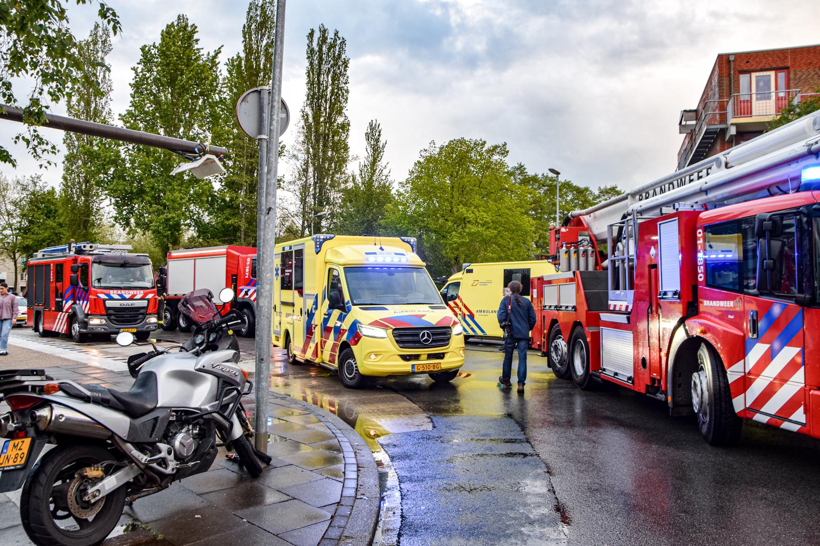 De brandweer pakt de spullen die zij gebruikt hebben weer in. Een groot gebied rond de flat is nog altijd afgesloten.
