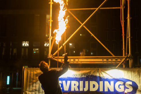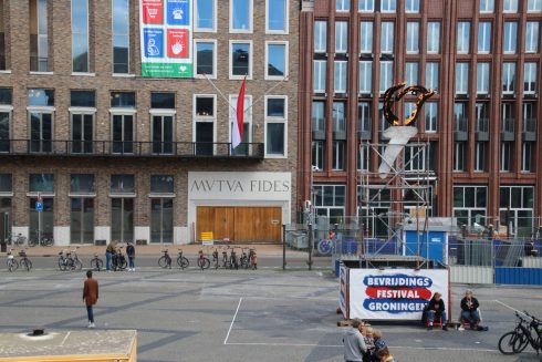 Toch gaat Bevrijdingsdag niet onopgemerkt voorbij. Op de Grote Markt werd om klokslag middernacht het Vrijheidsvuur ontstoken door Commissaris van de Koning René Paas (CDA) en burgemeester Koen Schuiling (VVD). Dit vuur blijft tot vanavond middernacht branden. “Maar ook elders in de stad kun je niet om het feit heen dat het vandaag een feestdag is”, zegt Lameris. “Heel veel mensen hebben de Nederlandse driekleur aan de gevel wapperen en dat geeft ondanks het coronavirus toch wel een beetje een feestelijk gevoel.”