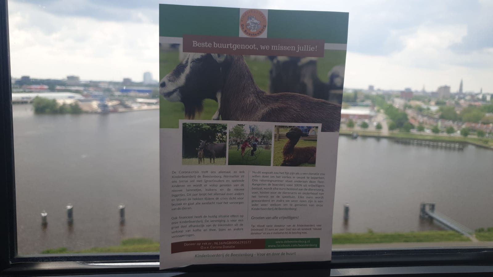 De oproep om een donatie te doen wordt gedaan in een folder die de afgelopen dagen huis-aan-huis verspreid is in de wijk. “Normaal zit ons terras vol met (groot)ouders en spelende kinderen en wordt er volop genoten van de nieuwe lammetjes, kuikens en de nieuwe biggetjes”, staat te lezen in de folder. “Dit jaar loopt het allemaal even anders en blijven de hekken tijdens de coronacrisis dicht voor het bezoek en gaat alle aandacht naar het verzorgen van de dieren.”