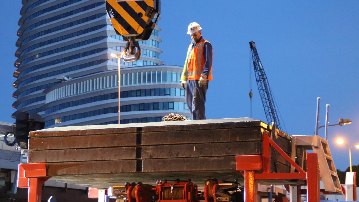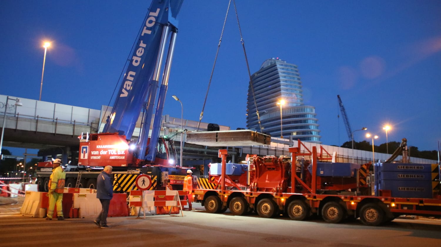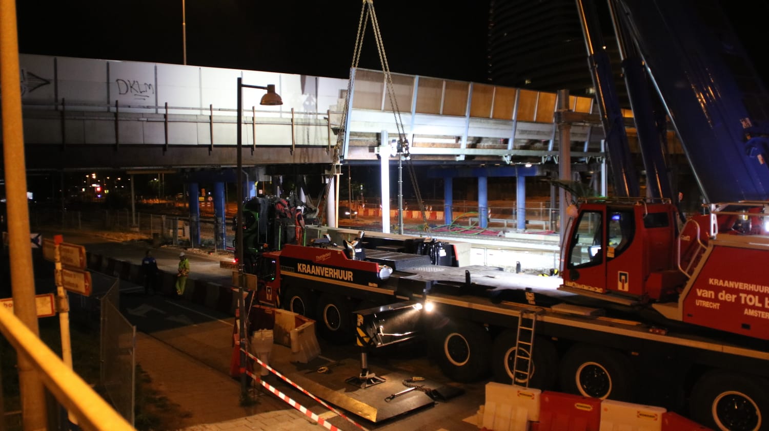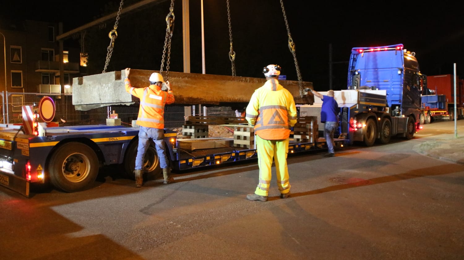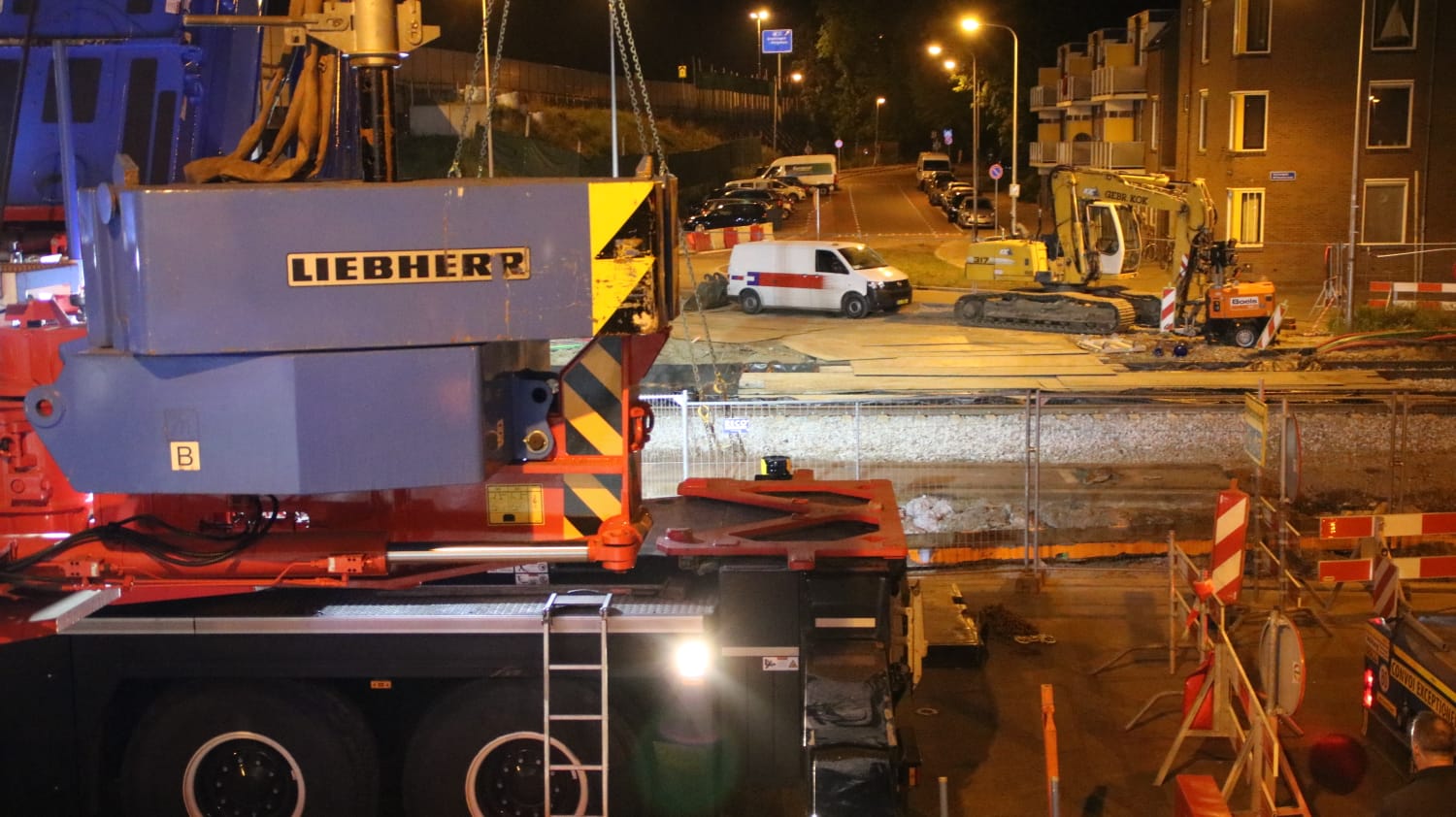 Net als vorige week arriveerde op de late woensdagavond een telescoopkraan. “Nadat de kraan gestempeld was zijn er verschillende betonblokken gehesen”, vertelt Raymond Meter van meterfotografie.nl. “Ook werden de laatste stelplaten van de voormalige Esperantokruising weggetakeld.” De stelplaten werden voorheen gebruikt door het verkeer om over de spoorwegovergang te kunnen rijden.