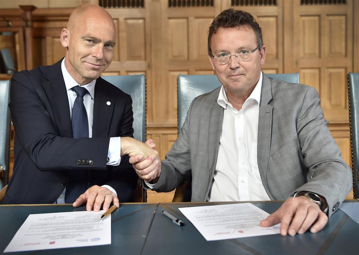 Prof. dr. Patrick Verkooijen (L) en RUG-bestuursvoorzitter Jouke de Vries (R) - Foto: Global Center on Adaptation @GCAdaptation