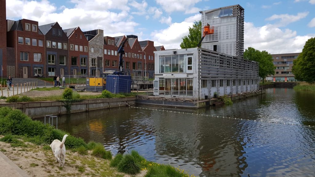 De officiële sloop begon afgelopen vrijdag maar nu is ook aan de buitenkant te zien dat de ontmanteling begonnen is. Met een hoogwerker wordt de houten betimmering weggehaald. De CiBoGa-boot werd in de jaren negentig gebouwd als tijdelijke voorziening voor de gebiedsontwikkeling van het terrein. Die ontwikkeling duurt veel langer waardoor de boot er langer ligt dan waar van tevoren rekening mee was gehouden. Inmiddels verkeert de constructie in zo’n slechte staat dat reparatie volgens de gemeente niet meer rendabel is. Ook verplaatsen is geen optie meer.