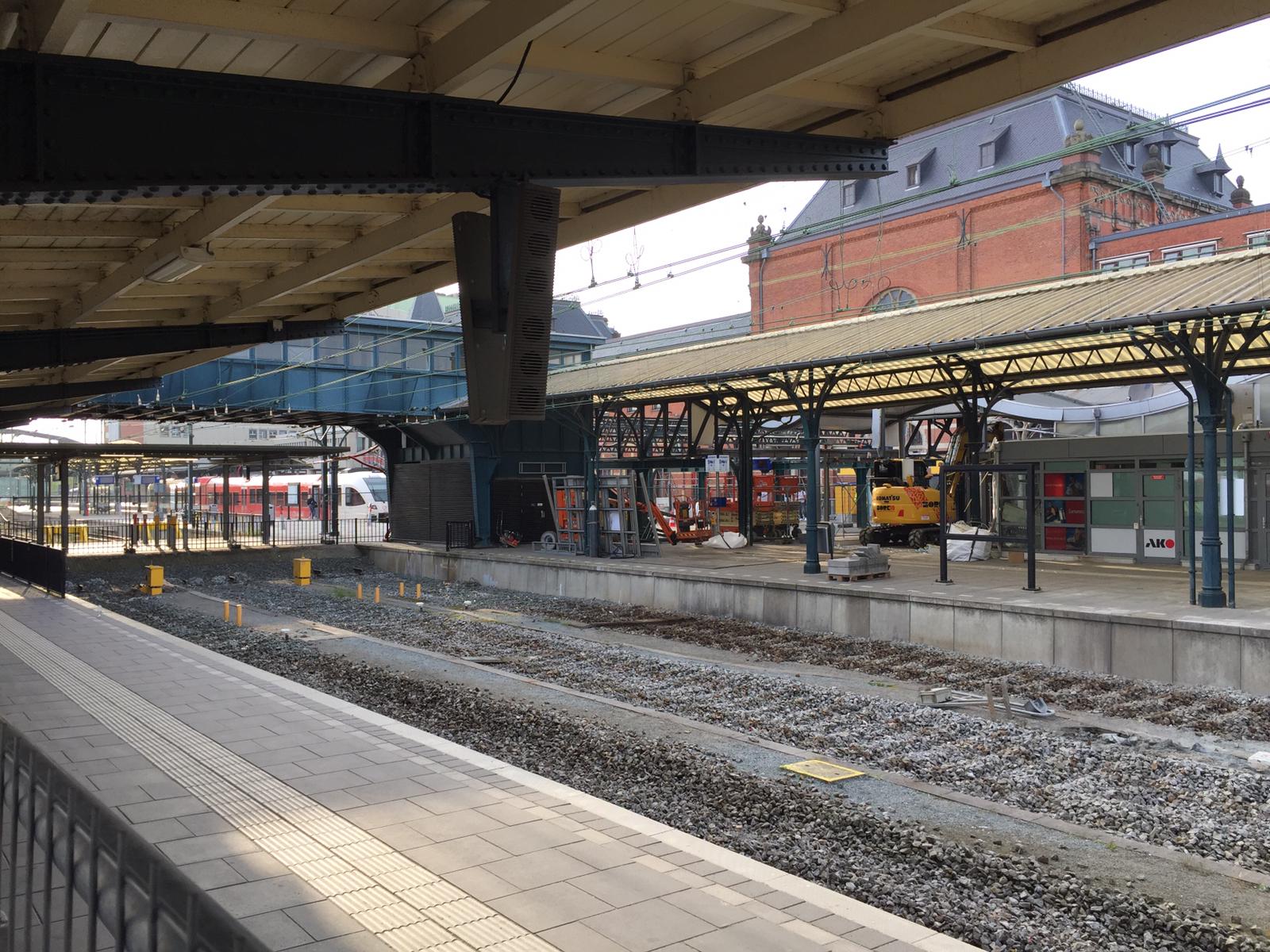 Op het Hoofdstation wordt dit weekend gewerkt aan de verdere ontmanteling van de perronkappen. Afgelopen week gebeurde dit al aan de westzijde, nu moet ook de oostzijde er aan geloven. De perronkappen worden weggehaald zodat ze gerestaureerd kunnen worden. Ze voldoen niet meer aan de huidige eisen. Op het middenterrein is de sloop van de gebouwen begonnen waar de winkels in waren gevestigd. Vorige week werd de kiosk al met de grond gelijk gemaakt. Daarnaast valt op dat de sporen waar de intercitytreinen normaliter stoppen, ingekort zijn.