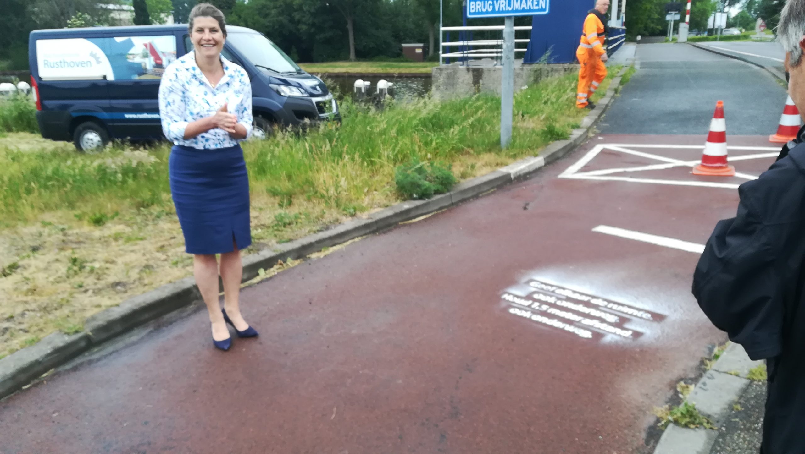 “Houd anderhalve meter afstand, ook onderweg”. Deze boodschap bracht gedeputeerde Fleur Gräper donderdagochtend met tijdelijke verf aan, op het fietspad bij de brug bij Waterhuizen.