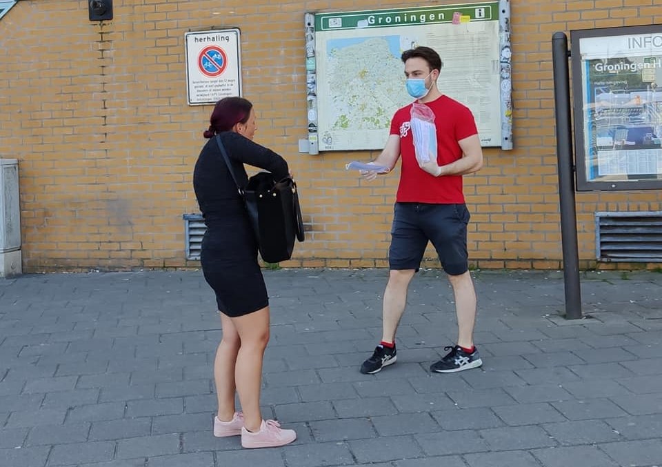 De Communistische Jongerenbeweging, CJB, afdeling Groningen heeft dinsdagochtend mondkapjes uitgedeeld op het Hoofdstation. Sinds afgelopen maandag is het dragen van mondkapjes in het ov verplicht.