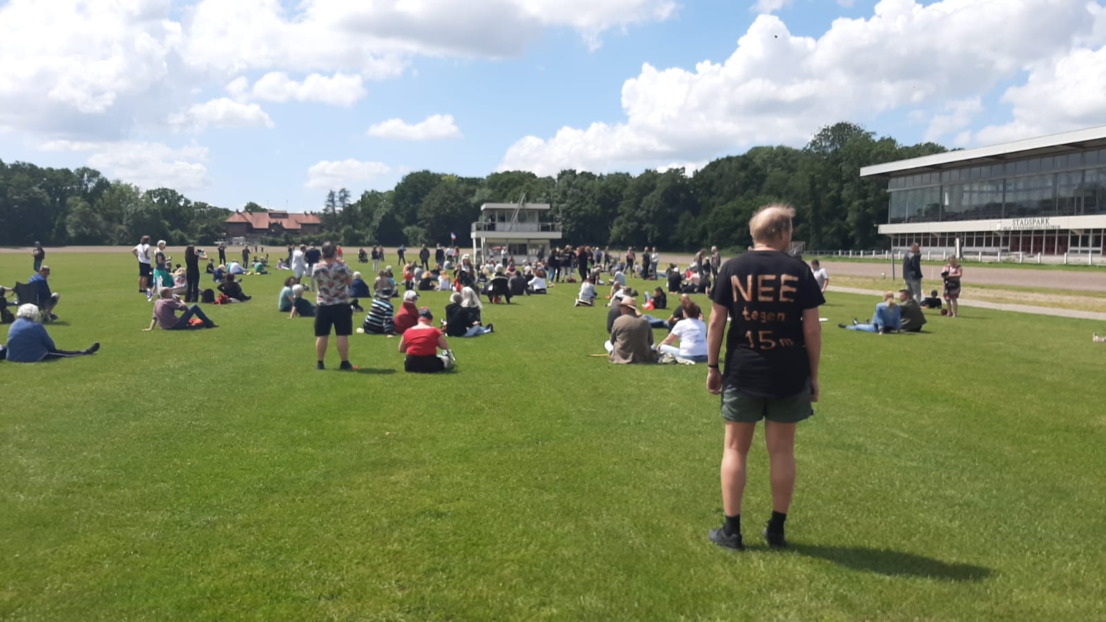 De demonstratie wordt gehouden tegen de coronamaatregelen. “Ik denk dat er zo’n 150 tot tweehonderd mensen hier op de Drafbaan zijn”, vertelt fotograaf Patrick Wind. “De sfeer is gemoedelijk en rustig. Verschillende mensen hebben borden bij zich waar teksten op staan als ‘geen verplichte vaccinatie’ en ‘geen 1,5 meter’.”