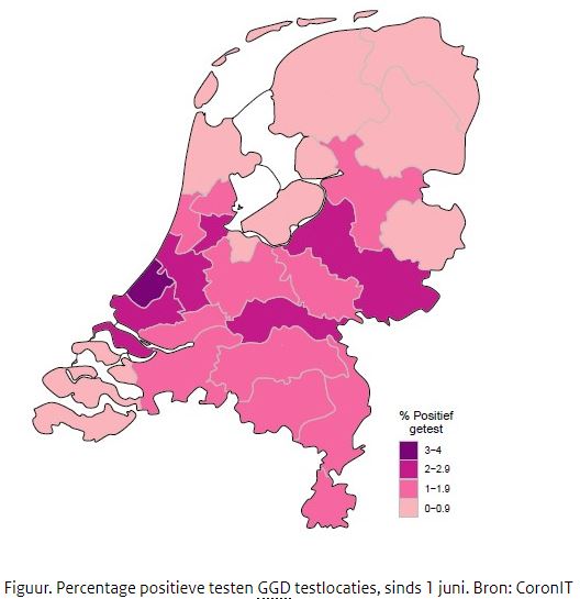 De meeste positieve testen werden afgenomen in de Veiligheidsregio Haaglanden. Daar werd een score van 3-4 procent behaald. Ook in de regio’s Rotterdam-Rijnmond, Hollands-Midden, Gelderland-Zuid en Noord- en Oost-Gelderland liggen het aantal positieve testen bovengemiddeld. In de drie noordelijke Veiligheidsregio’s ligt het aantal positieve besmettingen tussen de 0 en 0,9. Daarmee kan geconcludeerd worden dat de regionale verschillen groot zijn.