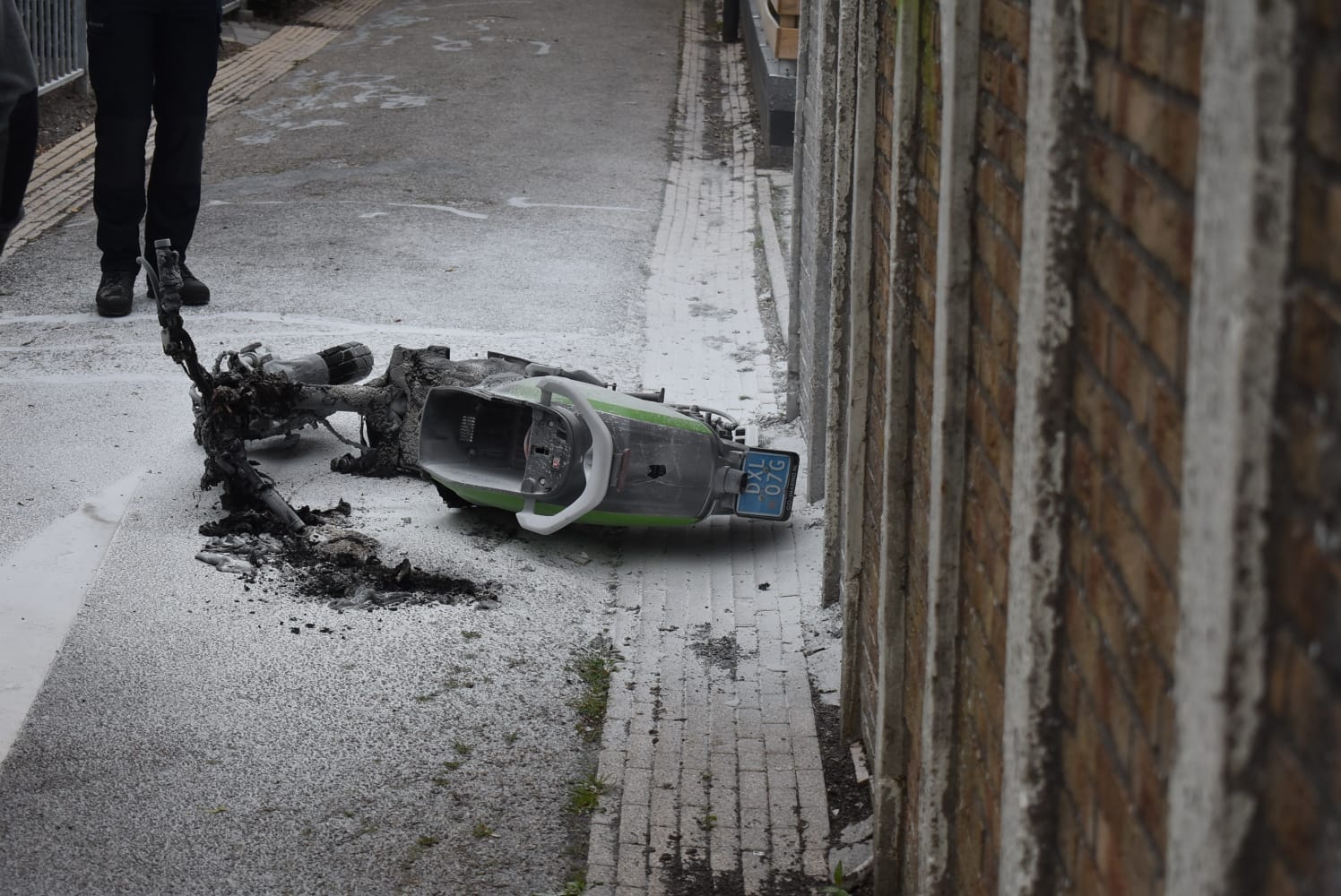 De melding van de brand kwam rond 19.50 uur binnen waarop er een tankautospuit ter plaatse werd gestuurd. “Het gaat om een scooter die je kunt huren”, vertelt Weening. “Buurtbewoners vertellen dat ze afgelopen weekend al de nodige instanties gebeld hadden omdat de scooter half gedemonteerd in de straat stond. Onder andere de accu lag er uit. Nu is het voertuig dus in de brand geraakt.”