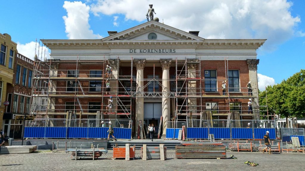 De Korenbeurs aan de Vismarkt staat momenteel in de steigers. Het monument krijgt de komende maanden een opknapbeurt.