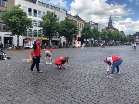 Met het krijt werden verschillende teksten op de stenen van de markt aangebracht. “Het werken aan een goede basis voor onze samenleving is ook, en juist nu tijdens deze coronacrisis, van groot belang”, laat een woordvoerder weten. De vakbond vindt het belangrijk dat er een fatsoenlijk inkomen voor iedereen is. Een minimumloon van veertien euro is daarbij het doel. Nu ligt dit nog op tien euro.
