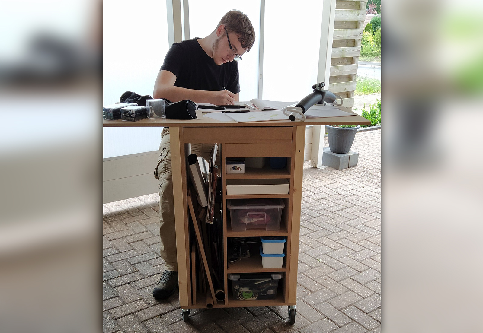 Studenten van de opleiding Industrieel Product Ontwerpen (IPO) aan de Hanzehogeschool konden door de coronacrisis lang niet in hun werkplaatsen aan de slag met de bouw van ‘mockups’ en prototypen. Maar van de nood werd een deugd gemaakt, want de studenten ontwierpen en bouwden thuis een mobiele werkplaats, geschikt voor een studentenkamer.