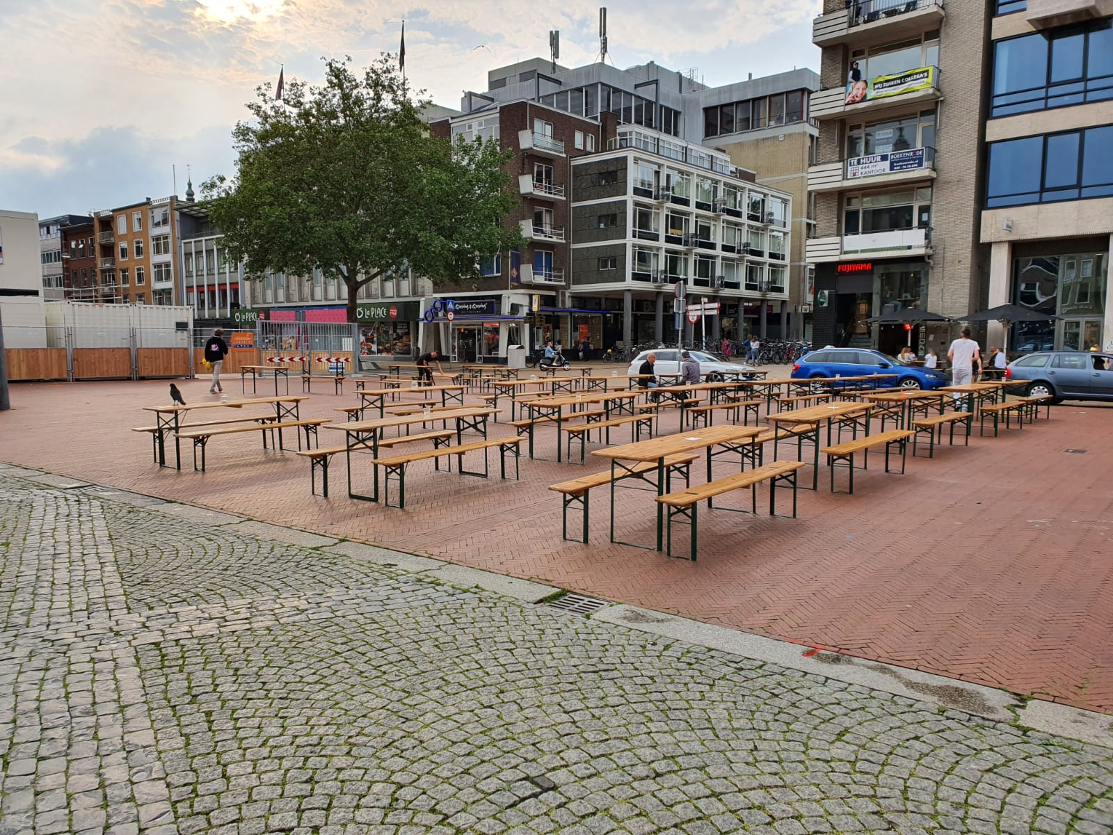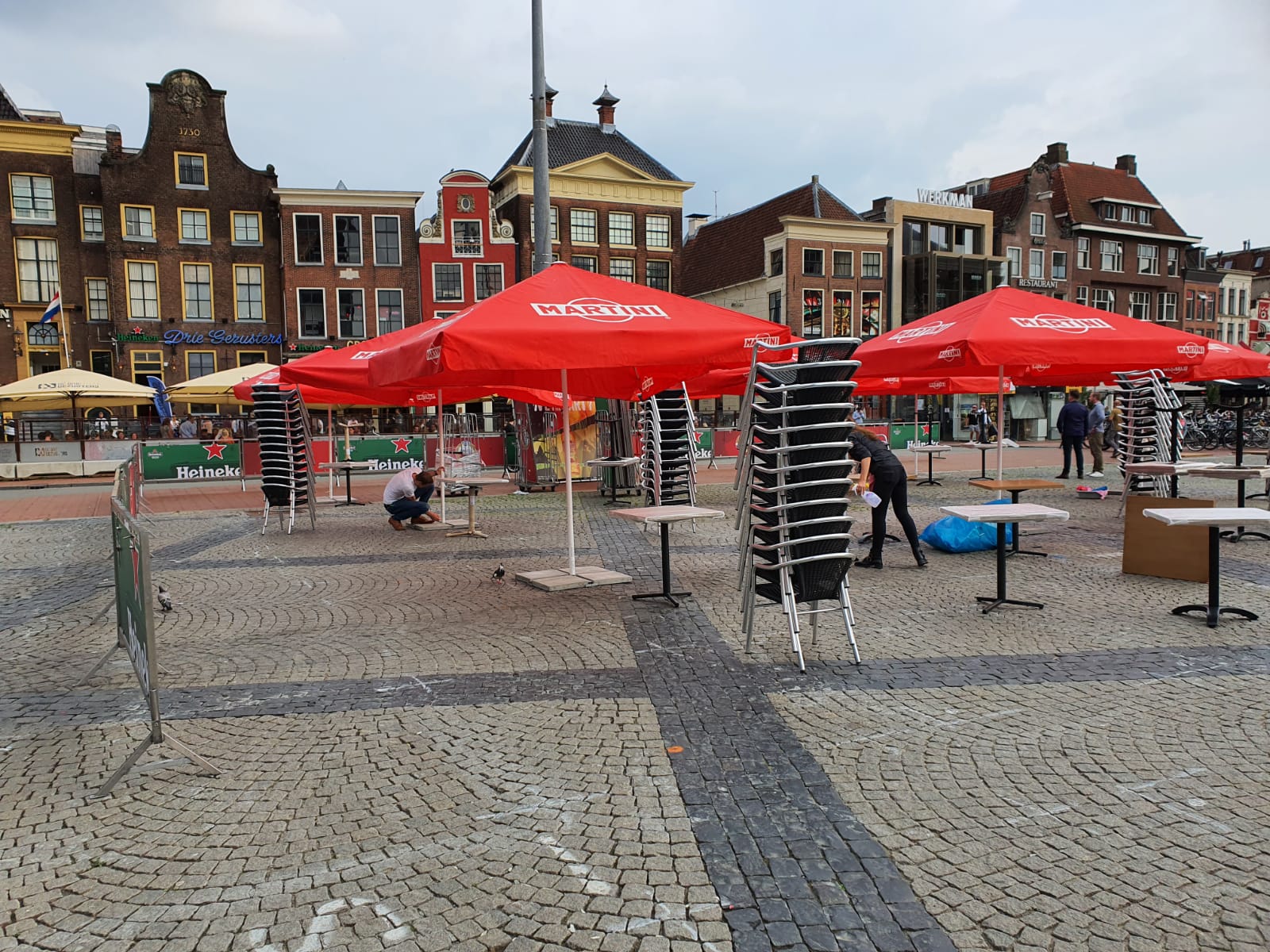 “Het ziet er heel gezellig uit”, ziet fotograaf Patrick Wind vrijdagavond rond 19.45 uur. “De menukaarten zijn zojuist op de tafeltjes geplaatst en nu worden de laatste stoelen neergezet.” Het besluit om terrassen op de Grote Markt op te bouwen kwam vrijdagmiddag. Met de extra ruimte komt de gemeente horecaondernemers tegemoet die vanwege de coronamaatregelen niet hun volledige terras kunnen benutten. Door de maatregelen kan men minder tafeltjes kwijt op de eigen terrassen. De tafels die men niet kwijt kan mag men op de Grote Markt plaatsen.