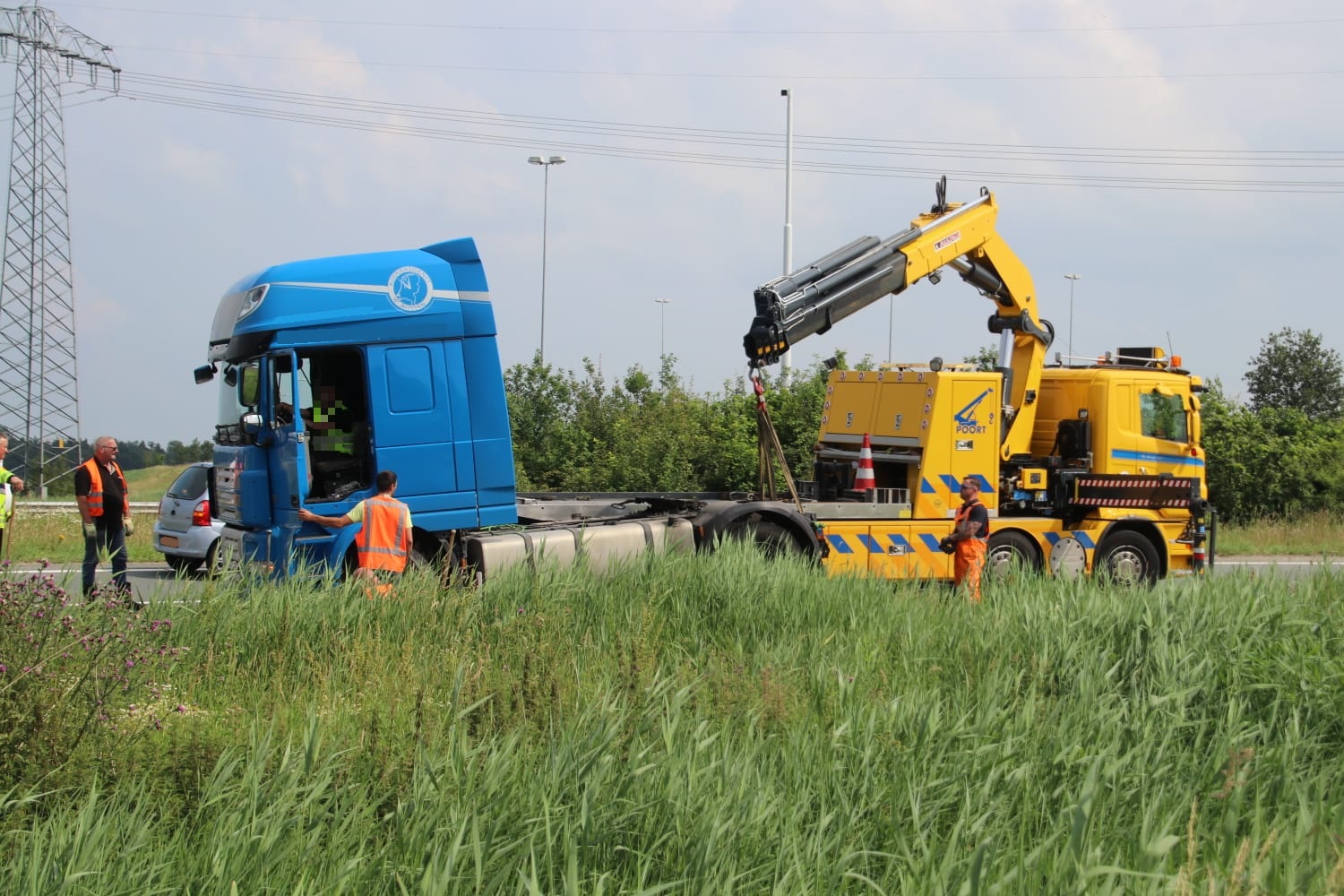 Een bergingsbedrijf heeft de vrachtwagen uiteindelijk weer vlot getrokken. Niemand raakte gewond.